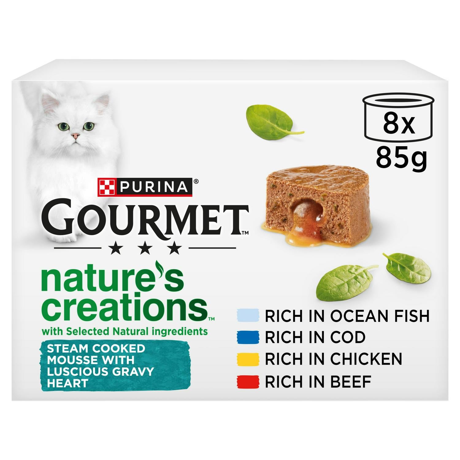 Gourmet Nature's Creations provides complete pet food suitable for adult cats in convenient 8 x 85g packs. This recipe features a delicious, steam-cooked mousse that contains a surprising, luscious gravy heart at its centre. It is formulated using high-quality, selected natural ingredients your cat will enjoy.