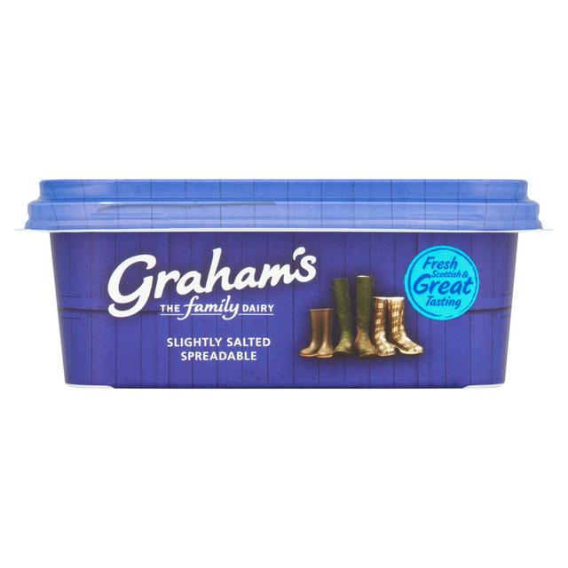 Grahams Spreadable Butter is crafted using fresh Scottish butter blended with vegetable oil for convenience. This formulation allows you to enjoy the full flavour straight from the refrigerator without hardening. The butter carries a touch more salt than standard recipes for a satisfying, slightly saltier taste profile.