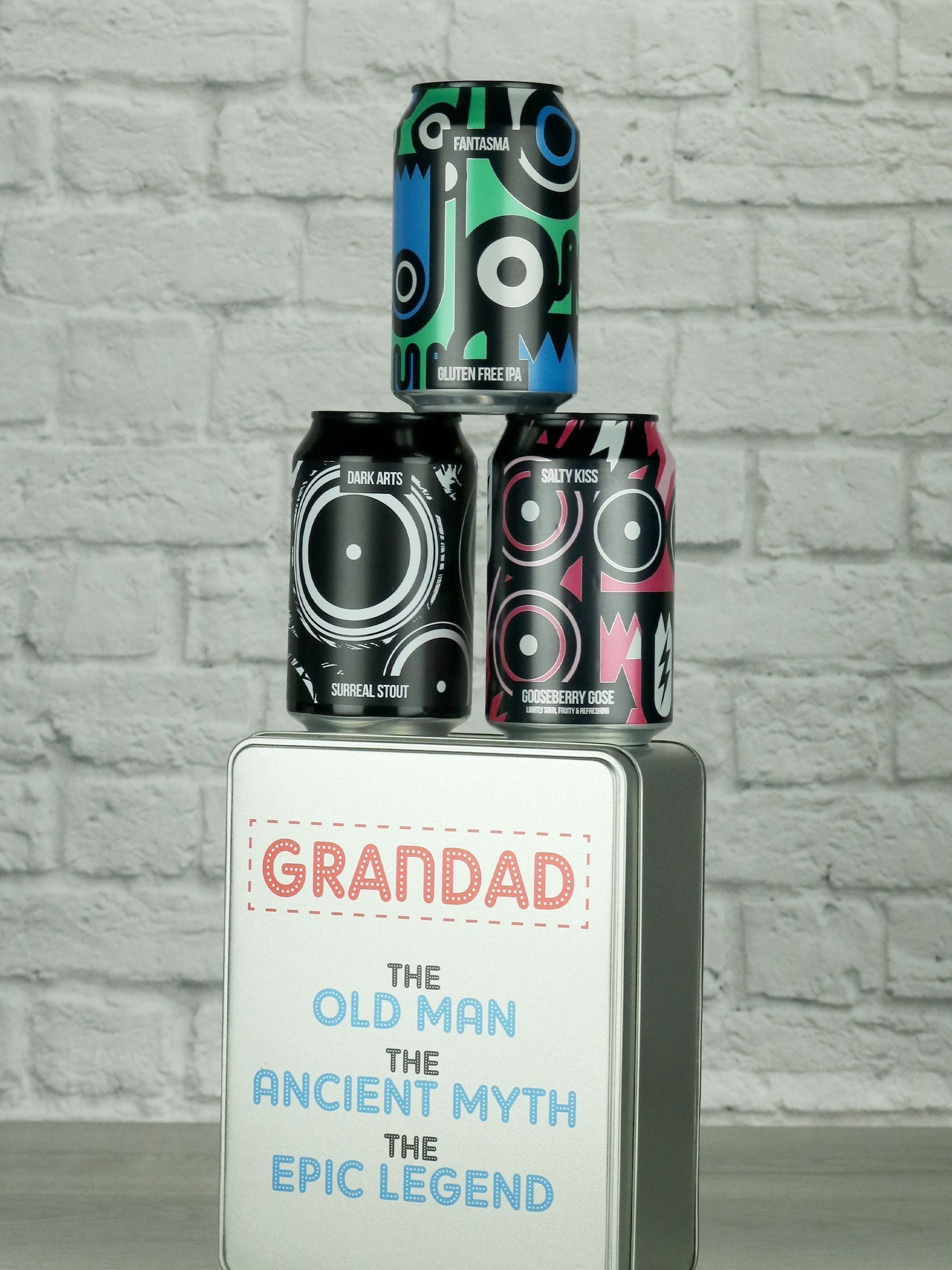 Craft Beer gift tin for legendary Grandad's. Featuring three craft beers from the Magic Rock brewery. Presented in a dad themed hinged metal tin. Volume 3x 330ml Bottles Max 6.5% Alc Vol. (If a beer is out of stock a suitable replacement will be substituted).