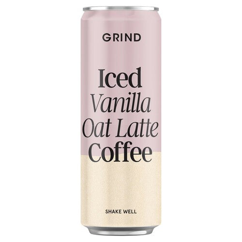 GRIND presents its Iced Vanilla Oat Latte, a convenient, ready-to-drink coffee beverage designed for immediate enjoyment. This chilled latte combines espresso, sweet vanilla notes, and creamy oat milk in a modern canned format. It offers a sophisticated coffee shop experience without the need for preparation.