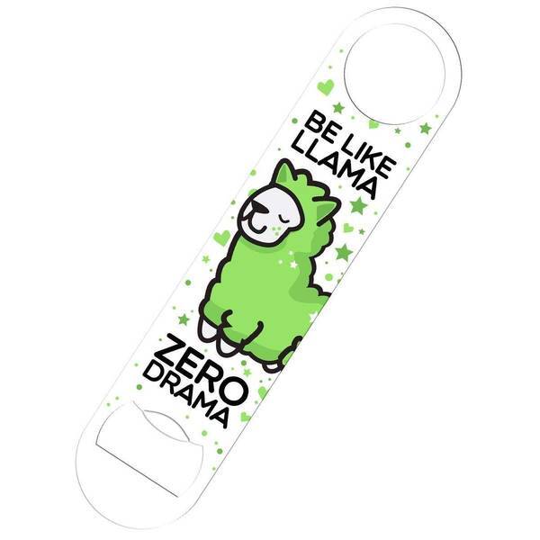 Grindstore presents this unique bottle opener, perfect for adding a touch of personality to your drinks service. This functional bar blade features a distinctive 'Be Like Llama Zero Drama' design for easy handling and recognition. It serves as a reliable tool for efficiently removing bottle caps when entertaining guests or relaxing at home.