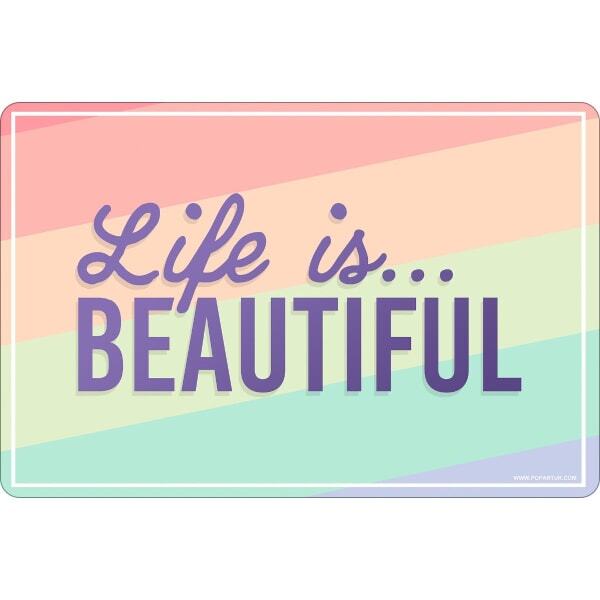 This Grindstore tin plaque features the positive sentiment "Life Is Beautiful" displayed in vibrant rainbow text. Crafted from durable tin, this item is intended to provide a cheerful visual accent for interior spaces. Its compact size allows for versatile placement where you wish to add a subtle uplift to the room's aesthetic.