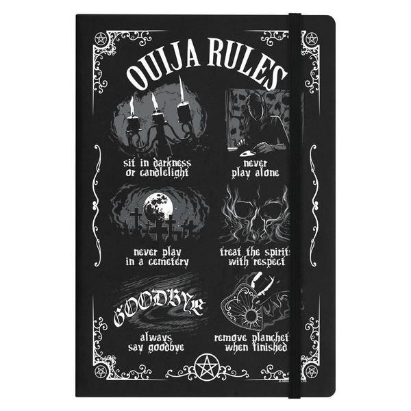 This Grindstore notebook features a distinctive Ouija board design on its cover. It is constructed from durable cardboard and paper, making it suitable for daily use. The book offers lined pages for organised writing tasks.