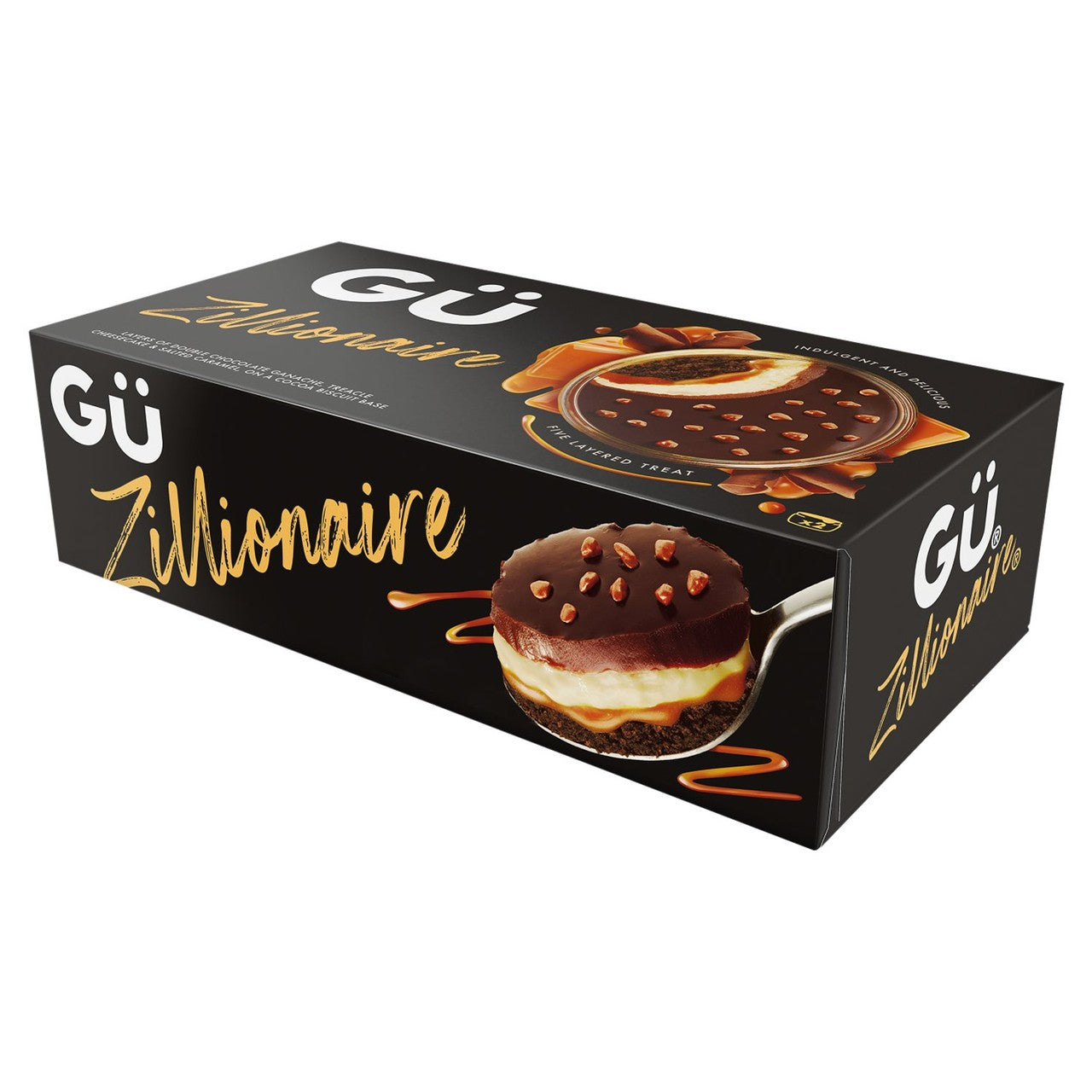 This GÜ Zillionaire is an indulgent, multi-layered treat perfect for satisfying a sophisticated craving. This package contains two individually portioned desserts offering a complex and decadent profile. The foundation is built upon a firm cocoa biscuit base, providing a satisfying textural contrast to the smooth fillings above.
