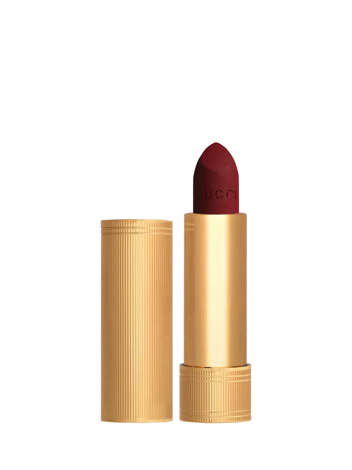 Rouge à Lèvres Matte Lipstick's gold metal hued tube reveals evenly spaced narrow ribbed grooves etched vertically into its length. Precise and elegant, the packaging recalls the era when lipstick tubes were an execution in art and decoration.