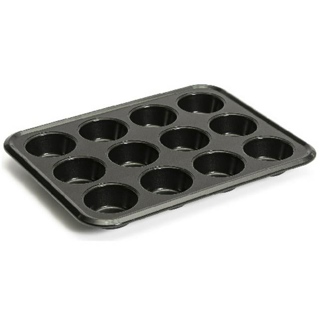 Bake up uniform batches of your chosen treats using this 12-cup muffin tray from Habitat. This carbon steel bakeware is designed to deliver consistent results across all twelve cups. It includes practical features for easy handling both during cooking and for later storage.