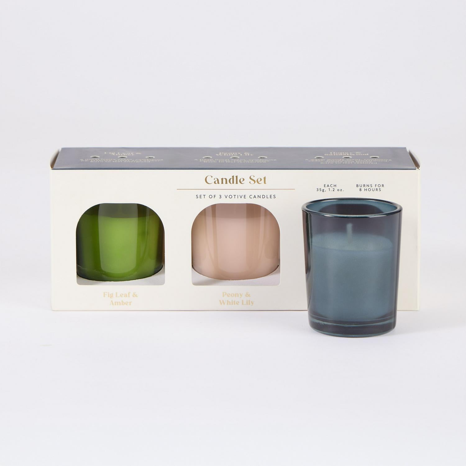Read MoreA variety of fragrances in a sleek set. Presented in tinted glass holders, this trio of votive candles are a smart choice. The pink candle features the gentle sweetness of peony, white lily and rose, with a touch of fresh apple. The green captures the freshness of fig leaf softened by warm, golden amber with a gentle swirl of jasmine and violet. And the blue features warm honey sweetness and soothing woody sandalwood.