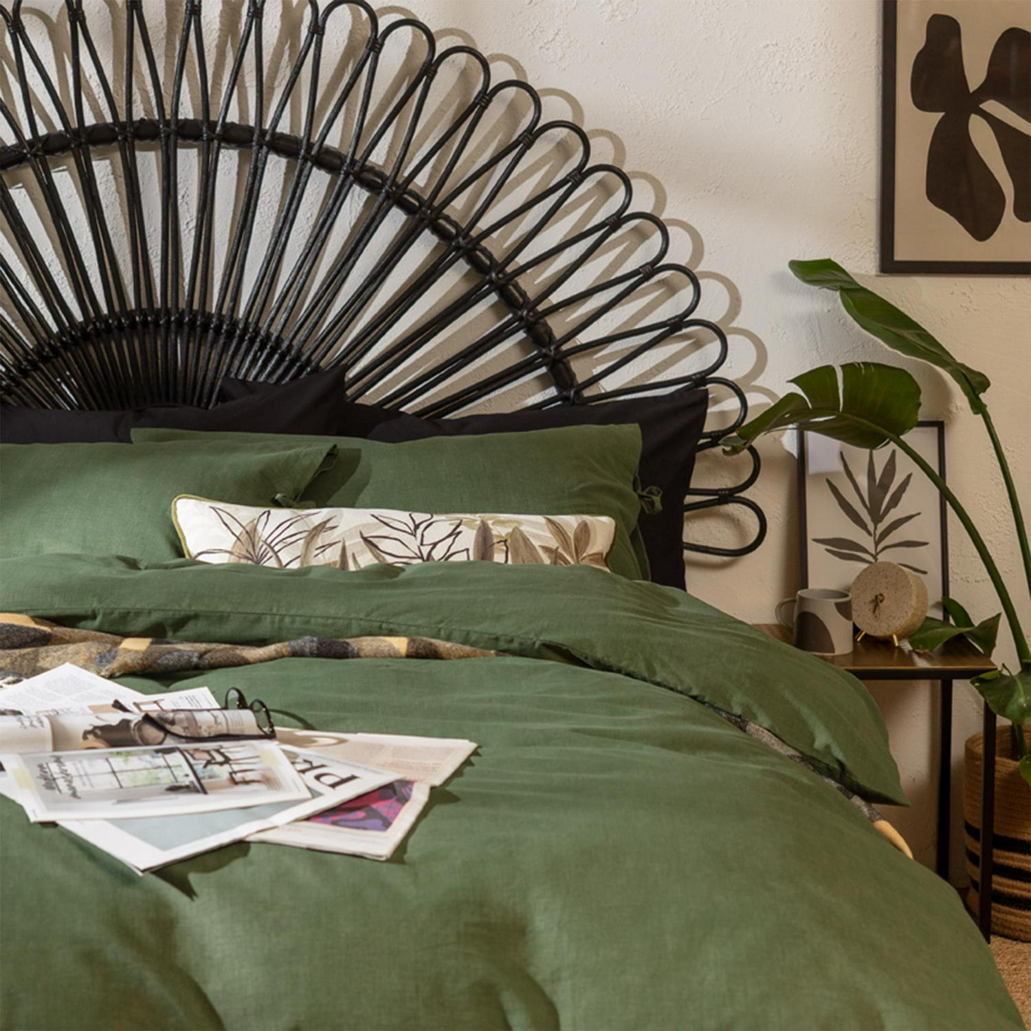 Read MoreGreens are good for you. In a rich, mossy shades, this duvet set brings a soothing feel to your bedroom. Crafted from 100% cotton, it's soft, snuggly, and inviting. Ideal for a good night's rest. And those cute tie details? What a delightful finishing touch. Pair with earthy neutral tones for an all-over organic look. Next stop, dreamland.
