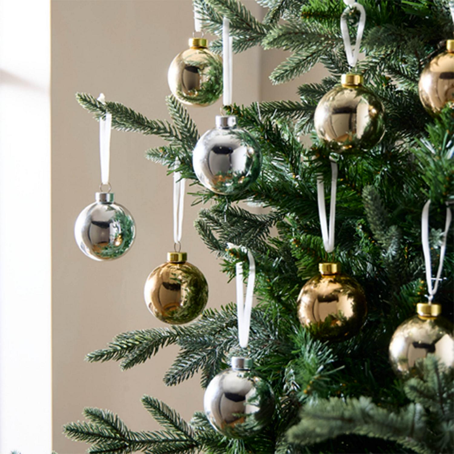 Capture the festive spirit this season with this set of 9 Habitat Christmas baubles in contrasting colours. These ornaments feature a glossy glass surface designed to reflect light beautifully across your tree. Enjoy the superior shine and traditional aesthetic offered by this mixed gold and silver assortment for your decorations.