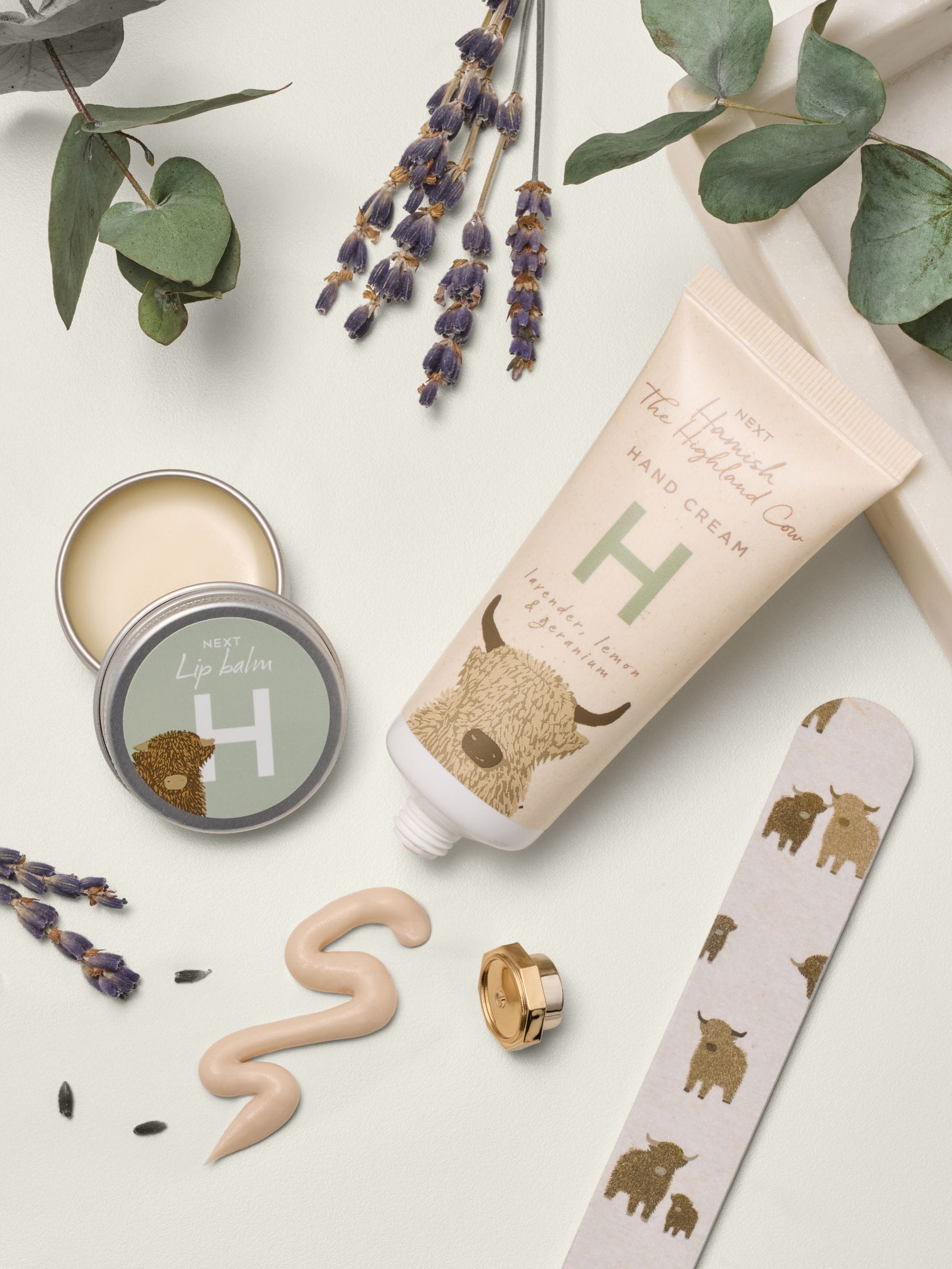 This charming hand cream gift set features the beloved Hamish the Highland Cow and includes a luxurious hand cream scented with lavender and geranium, enriched with vitamin E and shea butter. It also comes with a nail-tidying emery board and a lip balm infused with sweet raspberry, caramel, and vanilla notes.