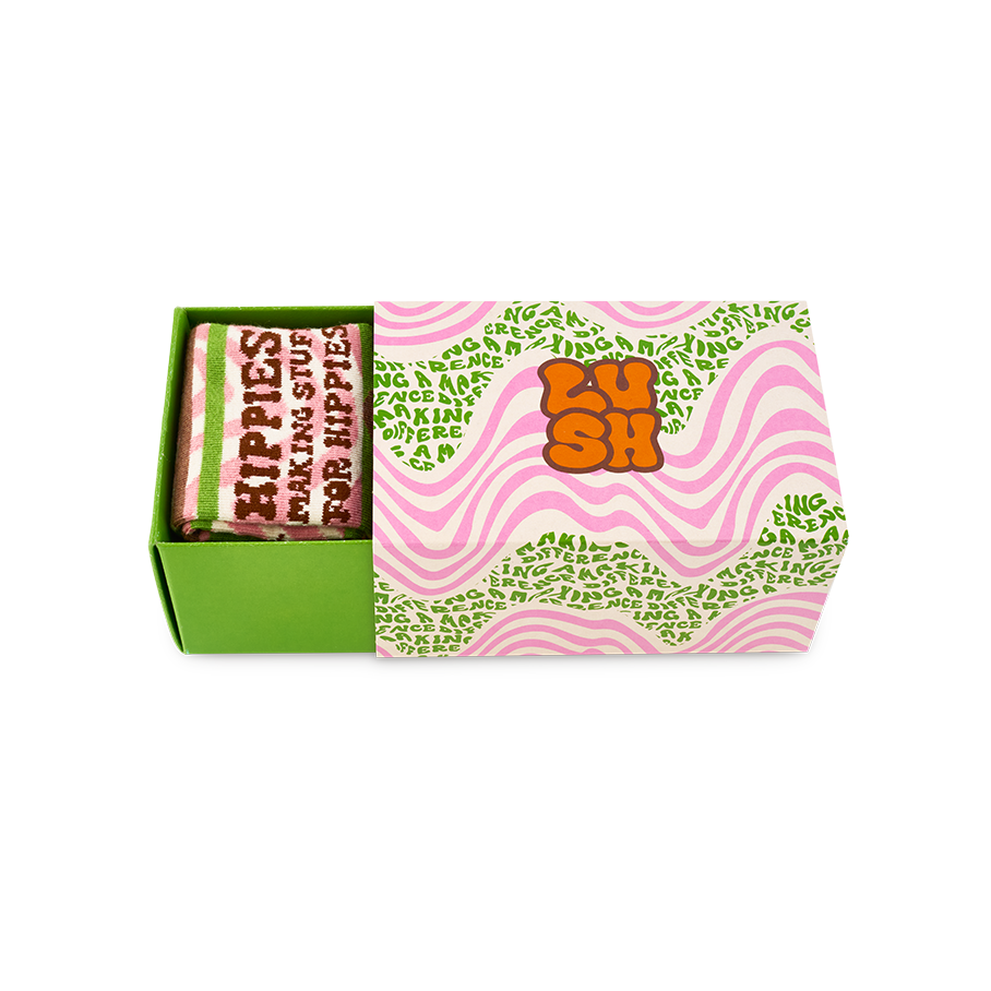 Hippy souls need hippy soles! Bring peace to your feet with this duo of super soft cotton socks. Featuring ‘hippies making stuff for hippies’ and ‘making a difference’ messaging, these socks are a celebration of our bohemian roots and a comfortable companion for marching to the beat of a different drum.