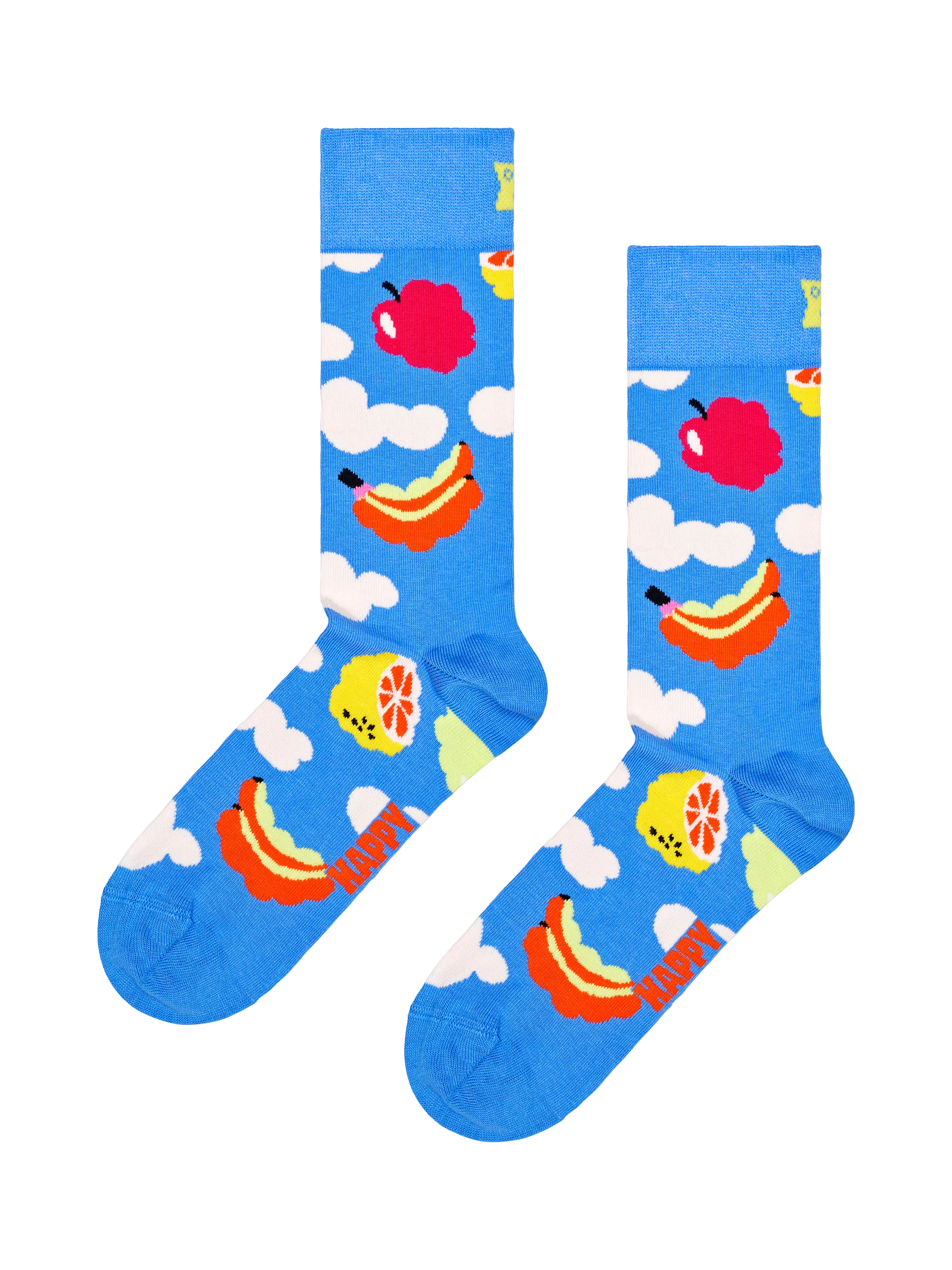 It's cloudy with a chance of fruit. Let dreams soar with these socks featuring fruits and clouds... or should we say fruit clouds?