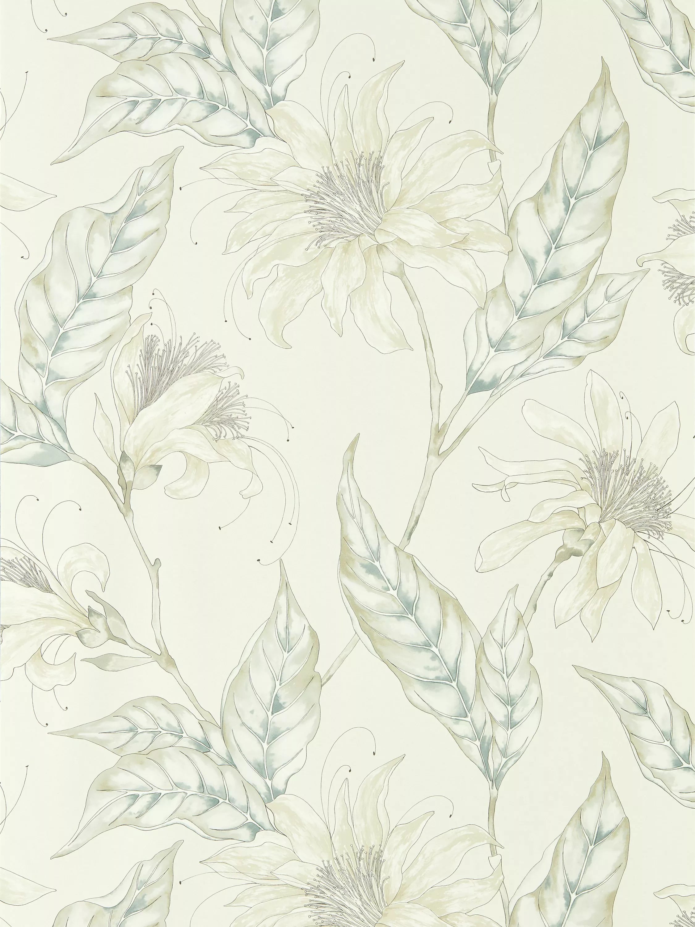 Hand drawn in pen and watercolour, this beautiful contemporary wallpaper is adorned with stylised tropical flowers. With its delicate painterly look and soft colour palette, intricate linework adds detail to this elegant design.