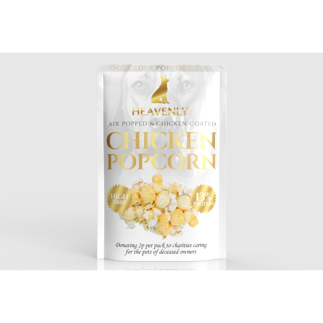 Heavenly Chicken Popcorn offers a unique, air-popped snack designed specifically for canine enjoyment. These novel dog treats are coated in real chicken flavouring, providing an exciting texture and taste your pet will appreciate. The product packaging highlights a commitment to pet welfare through charitable contributions with every purchase.