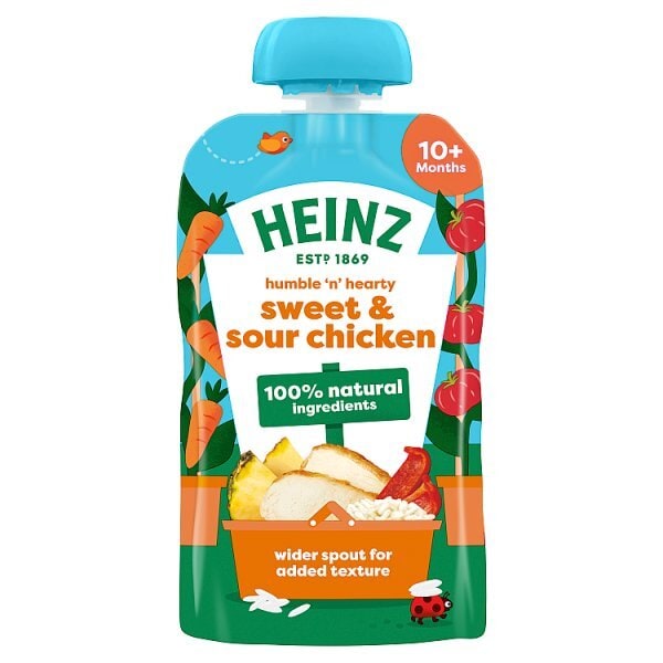This Heinz pouch offers a satisfying, chunky blend of chicken combined with a mild sweet and sour sauce, ideal for babies transitioning to textures. Simply made with selected natural ingredients, this meal supports a varied weaning diet for infants aged 10 months and over.