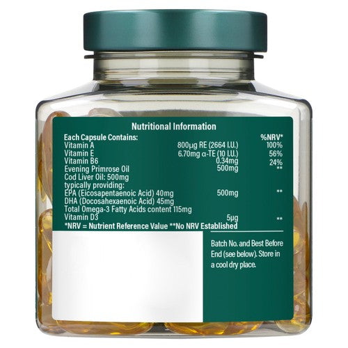 This combination supplement delivers pure Cod Liver Oil alongside Evening Primrose Oil in convenient 500mg capsules. It offers an excellent source of Omega 3 fatty acids, supporting overall wellbeing through essential nutrient intake. These capsules contribute towards the maintenance of normal skin, muscle function, and healthy bones.