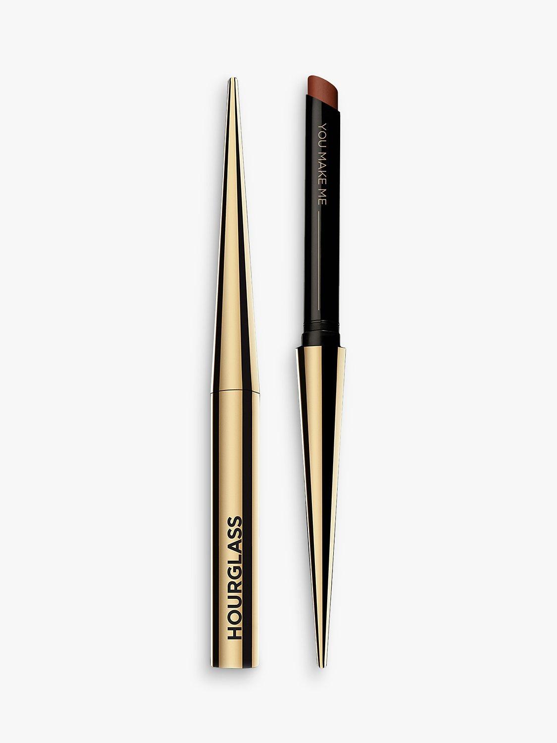This Hourglass Confession Ultra Slim Lipstick Refill, shade 'You Make Me', provides richly saturated colour pigment instantly. It features a luxurious, creamy texture that sets to a beautiful satin sheen upon the lips. This long-wearing formula integrates perfectly with the sleek gold casing for superior application control and comfort.