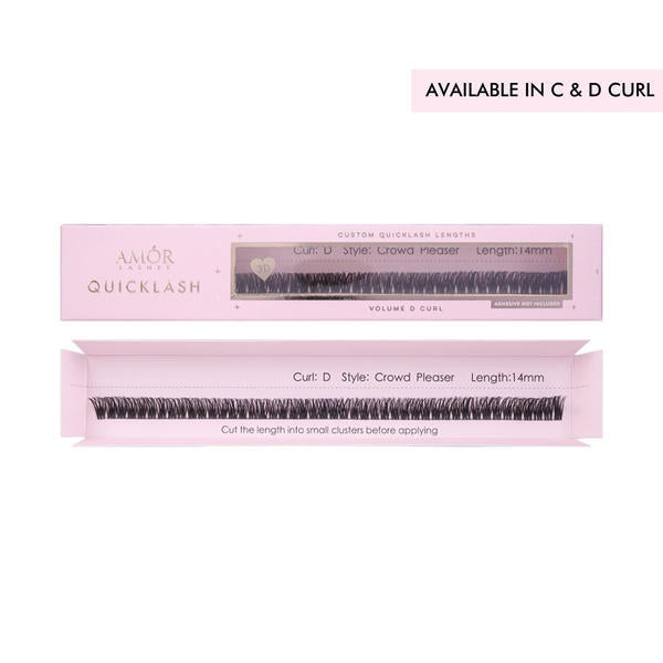 - do you love a set of salon volume lashes? If so, then Crowd Pleaser is your gal! Our QuickLash Lengths offer you the flexibility to create customised lash extensions in the comfort of your own home. Sold in a single long strip of your chosen curl, style, and length, QuickLash lengths allow you to personalise your look by mixing different lengths and styles, or even stacking them for added volume. Simply trim the length into clusters and apply with our QuickLash Bond (sold separately). You have the choice between a C or D Curl for your desired lash style. Opt for a C Curl for a subtle, natural look, or embrace the voluminous effect with a D Curl. Choose your preferred curl for stunning lashes tailored to your preferences, you can then select your preferred lash length from a range spanning from extra short to extra long!