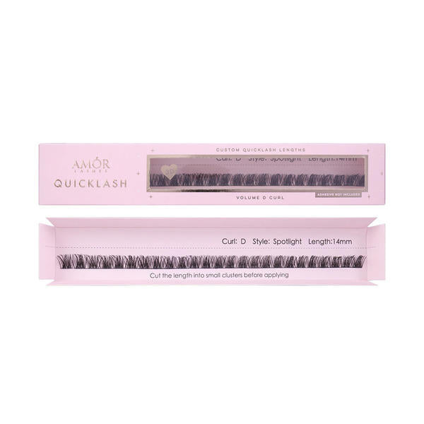 - a gorgeous 'spiky' lash Our QuickLash Lengths offer you the flexibility to create customised lash extensions in the comfort of your own home. Sold in a single long strip of your chosen curl, style, and length, QuickLash lengths allow you to personalise your look by mixing different lengths and styles, or even stacking them for added volume. Simply trim the length into clusters and apply with our QuickLash Bond (sold separately). You have the choice between a C or D Curl for your desired lash style. Opt for a C Curl for a subtle, natural look, or embrace the voluminous effect with a D Curl. Choose your preferred curl for stunning lashes tailored to your preferences, you can then select your preferred lash length from a range spanning from extra short to extra long!