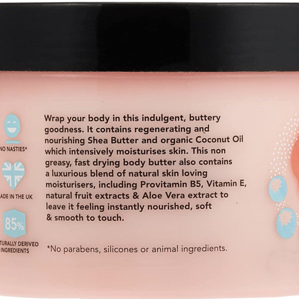 Read MoreWrap your body in this indulgent, buttery goodness. This beautifully scented Body Butter is rich, creamy and provides all day moisturisation. It contains regenerating and nourishing Shea Butter and organic Coconut Oil which intensively moisturises skin. This non greasy, fast drying body butter also contains a luxurious blend of natural skin loving moisturisers, including Pro Vitamin B5, Vitamin E, natural fruit extracts & Aloe Vera extract to leave it feeling instantly nourished, soft & smooth to touch. These Body Butters contain 85% of naturally derived ingredients and are designed for everyday use.