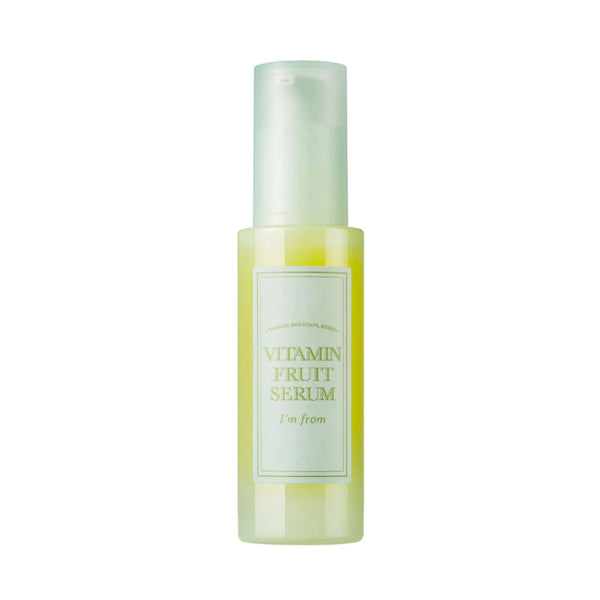 This I'm from Vitamin Fruit Serum features extracts derived from fruits near Hallae Mountain, Yeosu. It is formulated to deliver essential vitamins to your complexion effectively. The product is housed in a clear glass bottle, highlighting the focus on natural ingredient quality and preservation.