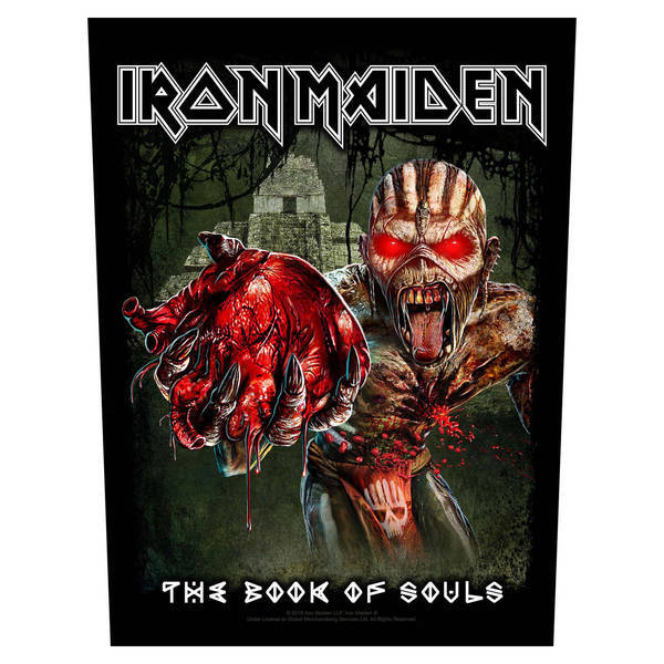 95% Cotton, 5% Polyester. Height: 36cm. Width: 30cm. Design: Logo, Printed, Tapered, Text. Characters: Eddie. 100% Officially Licensed. Back Patch, Overlocked Edge, Sew-On.