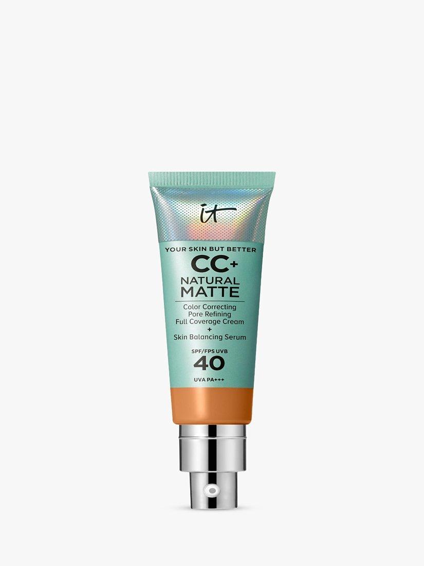 The IT Cosmetics Your Skin But Better CC cream offers full coverage in a Rich shade. This foundation provides a natural matte finish, perfect for managing oily skin concerns throughout the day. It contains beneficial skincare ingredients like hyaluronic acid and SPF 40 protection. This popular UK franchise item conceals redness and blemishes effectively while maintaining essential skin moisture balance.