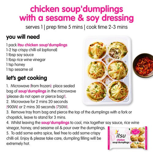 Discover the sensational itsu Chicken Soup Dumplings, a convenient and innovative frozen food option. During cooking, an umami broth melts deep inside the filling, resulting in a gloriously hot, soupy centre.