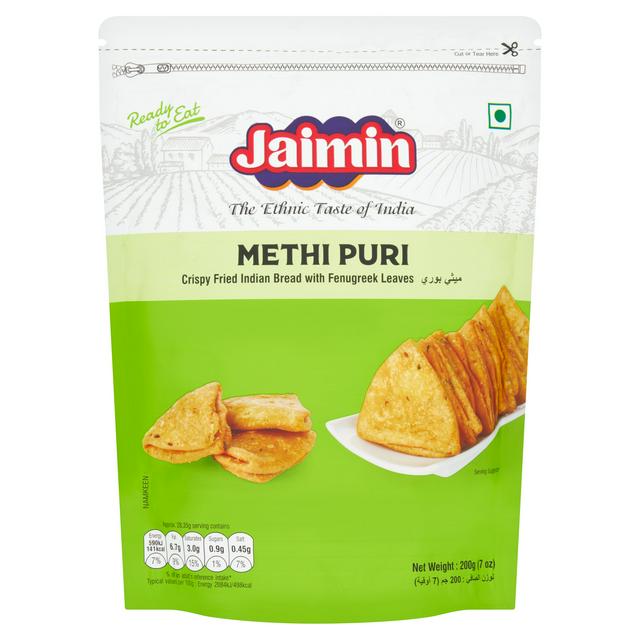 Jaimin Methi Puri delivers the authentic ethnic taste of India, offering a traditional culinary experience straight to your table. These crispy, fried Indian bread pieces are prepared with white flour and infused with fenugreek leaves. This ready-to-eat product is naturally suitable for vegetarian diets.