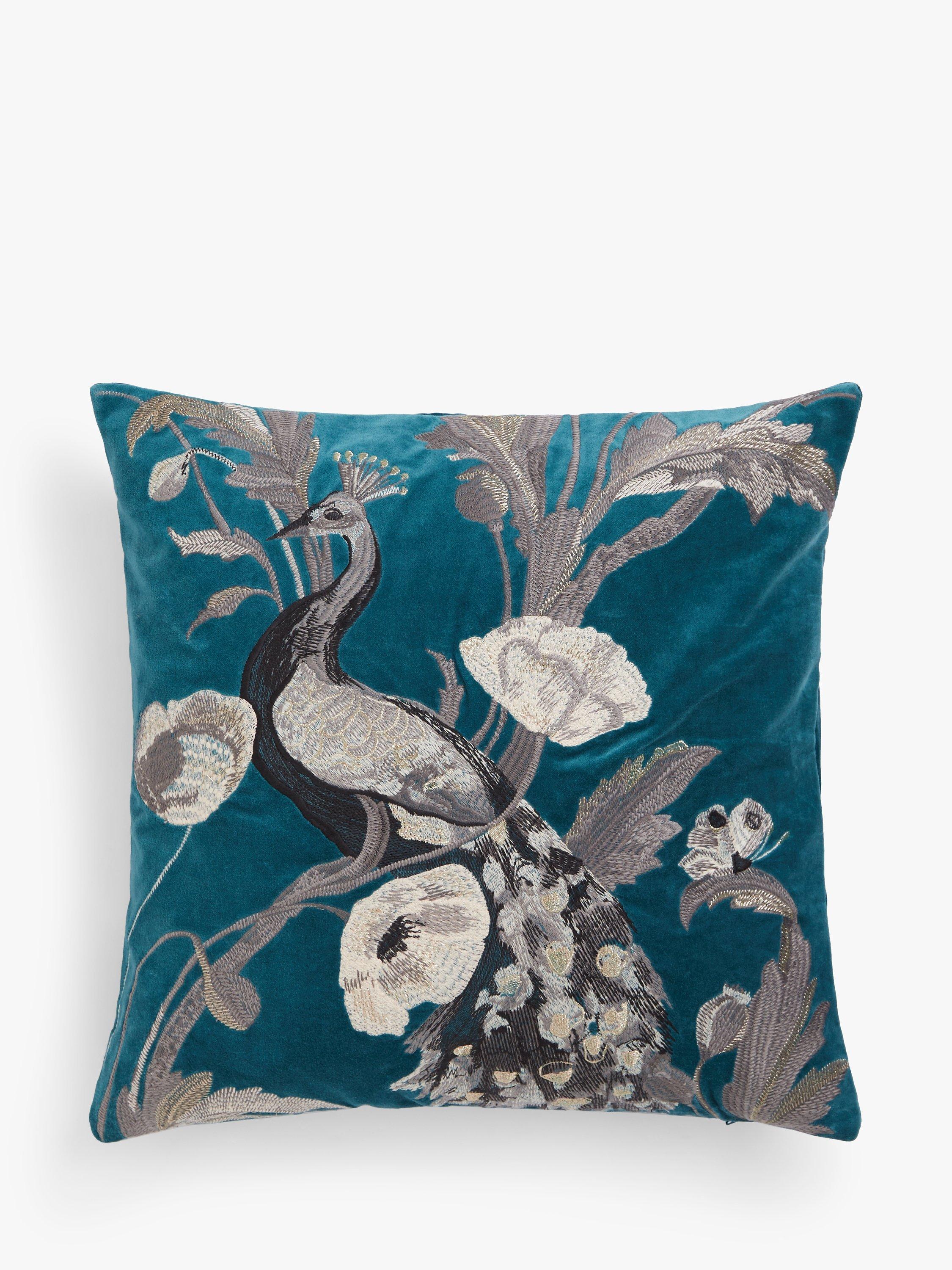 The John Lewis Java Cushion displays an exotic poppy and peacock motif, expertly machine embroidered onto fine cotton fabric. Luxurious accents of metallic gold thread elevate the detailed imagery, providing visual richness and texture for home decor. This quality cushion is designed to instantly update seating areas with subtle, sophisticated style.