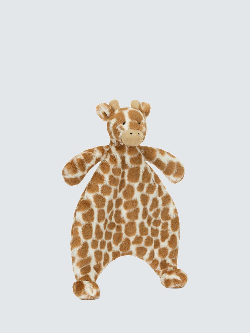 This Jellycat Bashful Giraffe Comforter offers comforting security and gentle companionship for babies. Crafted carefully using soft, recycled fibres, this adorable toy features iconic patterned fur for excellent tactile engagement. Little ones will enjoy holding a soft hand or cuddling the gentle, unstuffed tummy during peaceful, soothing sleeps.