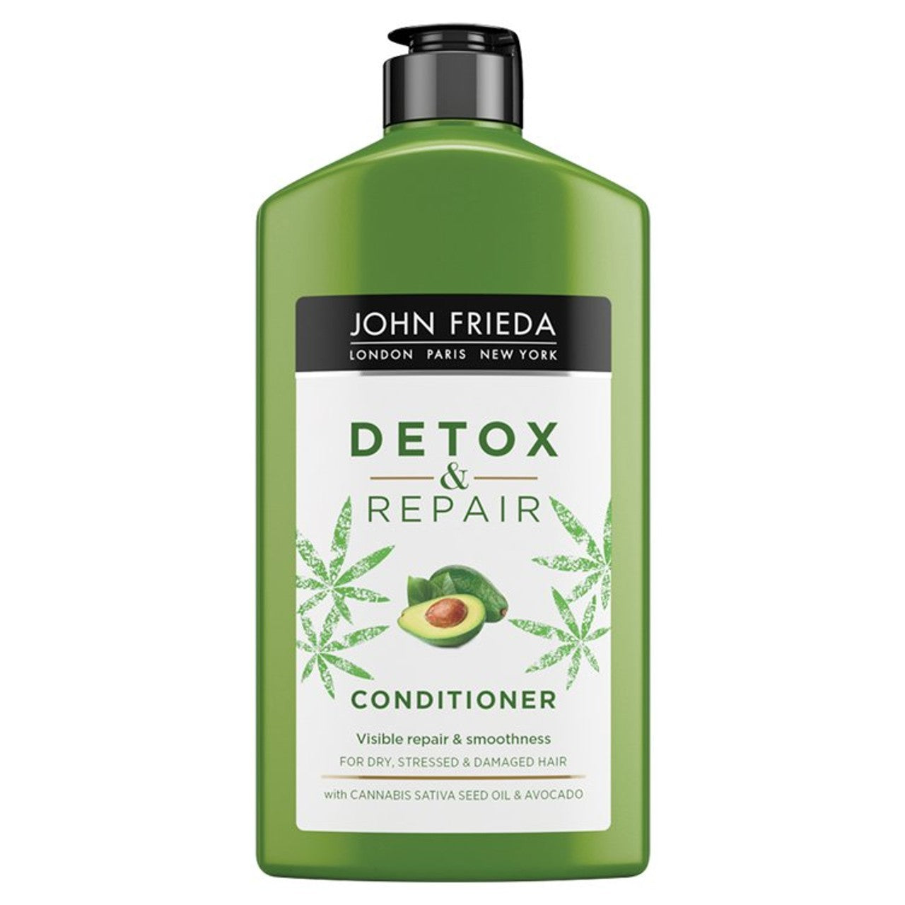 This John Frieda Detox & Repair Conditioner offers targeted care for dry, stressed, and damaged hair. Formulated with cannabis sativa seed oil and avocado, it delivers essential moisture to restore hair vitality.