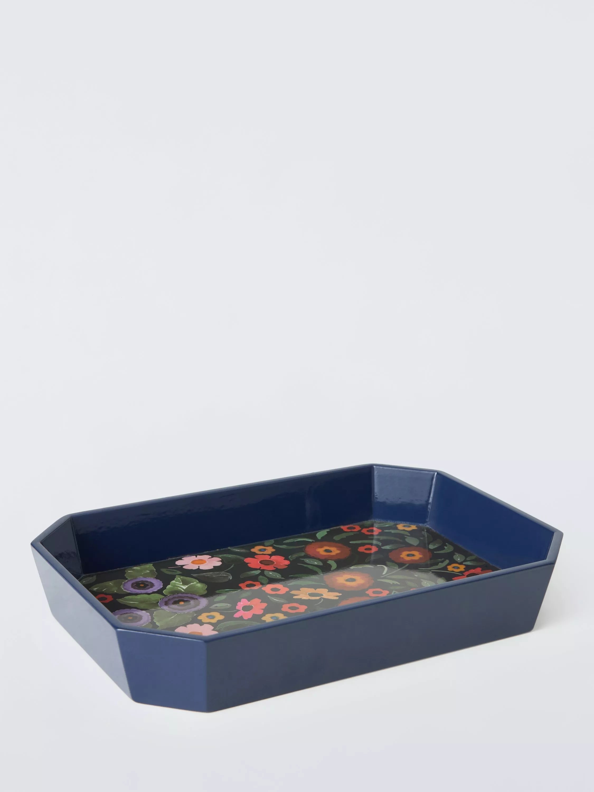 With a stunning, vintage-inspired floral pattern, this tray comes in an unusual, geometric shape.