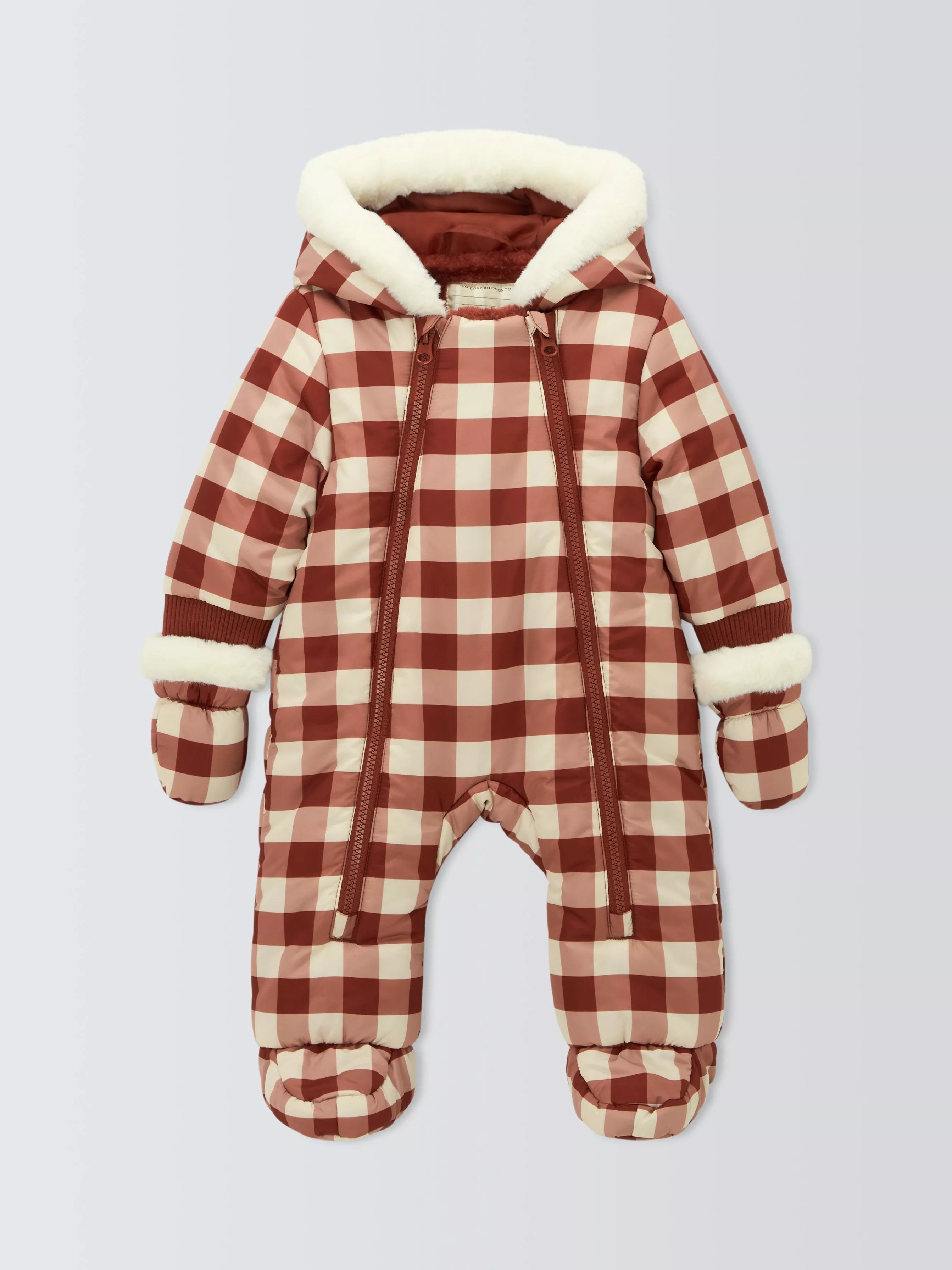 Baby snowsuit with all over check quilted design. Featuring a 2 zip opening and faux fur lining and hood trim.