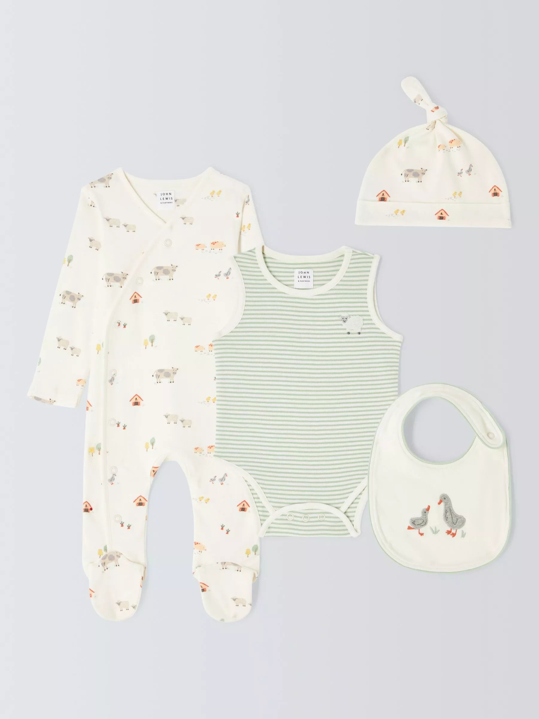 Made from 100% soft cotton, this set comes with a sleepsuit, sleeveless bodysuit, dribble bib and hat. A farm-inspired theme can be found across all the pieces from an embroidered sheep to an allover farm print.
