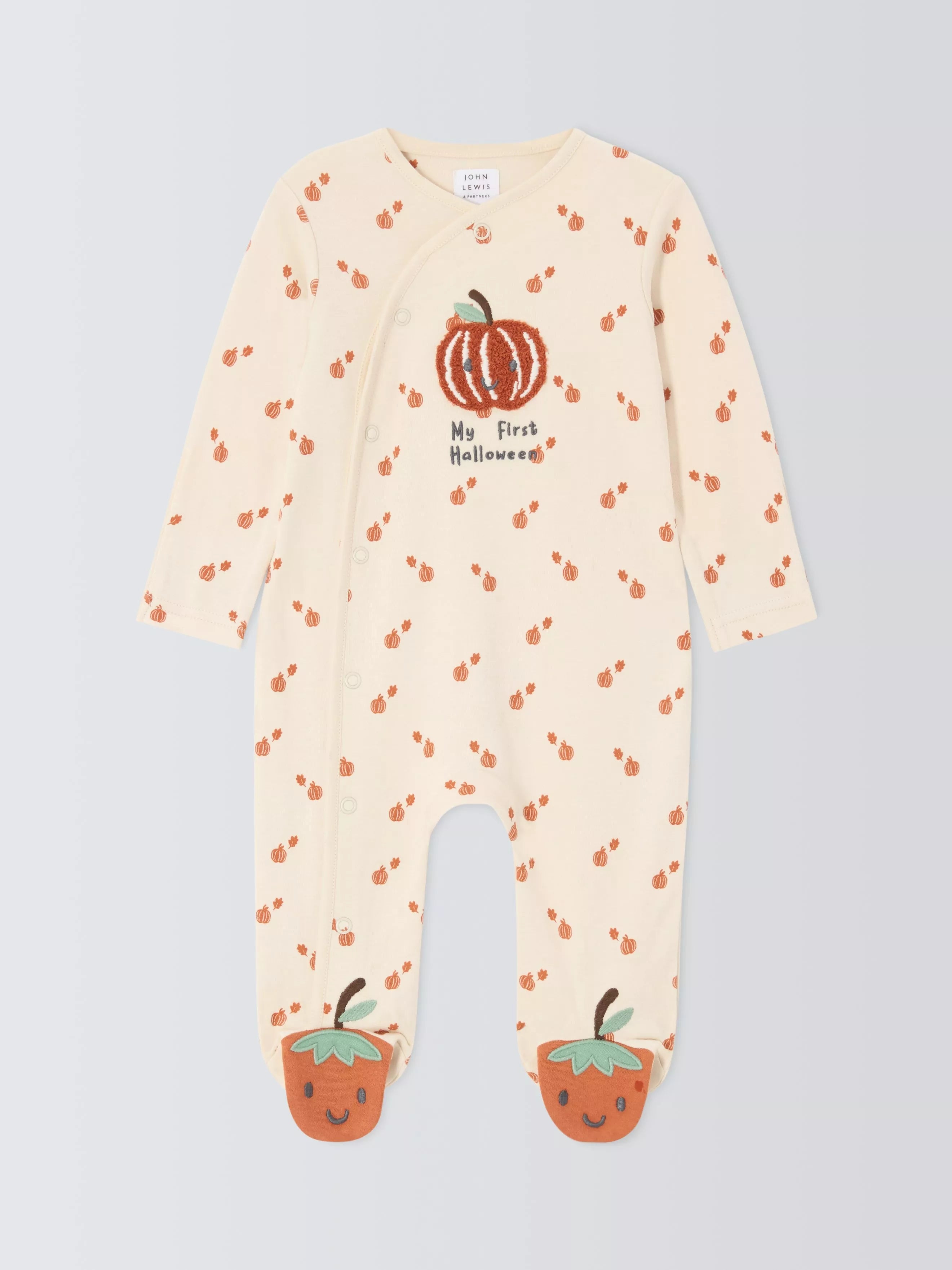 Celebrate baby's first Halloween with this super soft sleepsuit. With a pumpkin chest logo and all over pumpkin print, the theme extends down to the feet with two smiling pumpkin patches.
