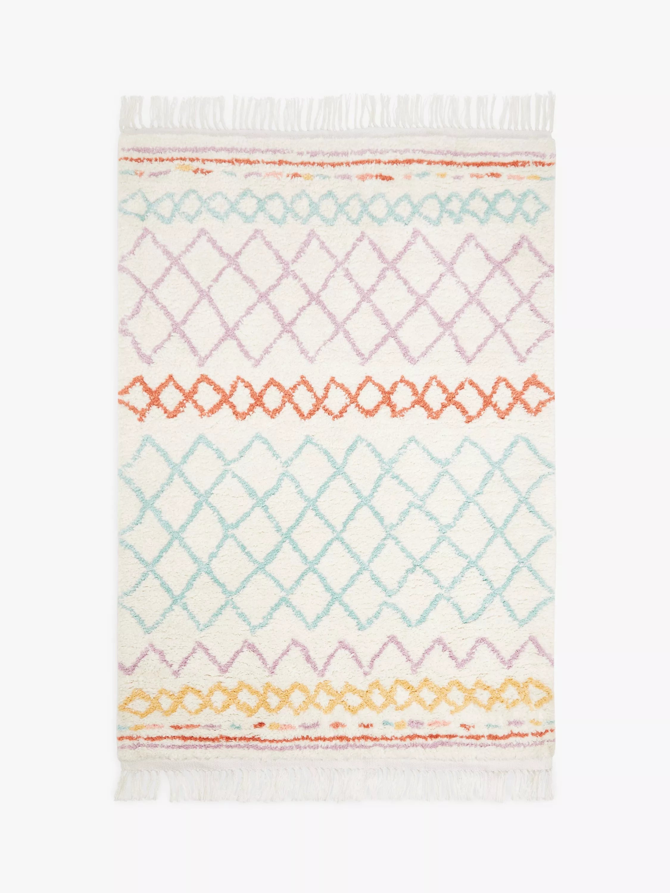 Add a vibrant touch to any child's room with this colourful Berber rug, perfect for adding comfort and style to a play area.