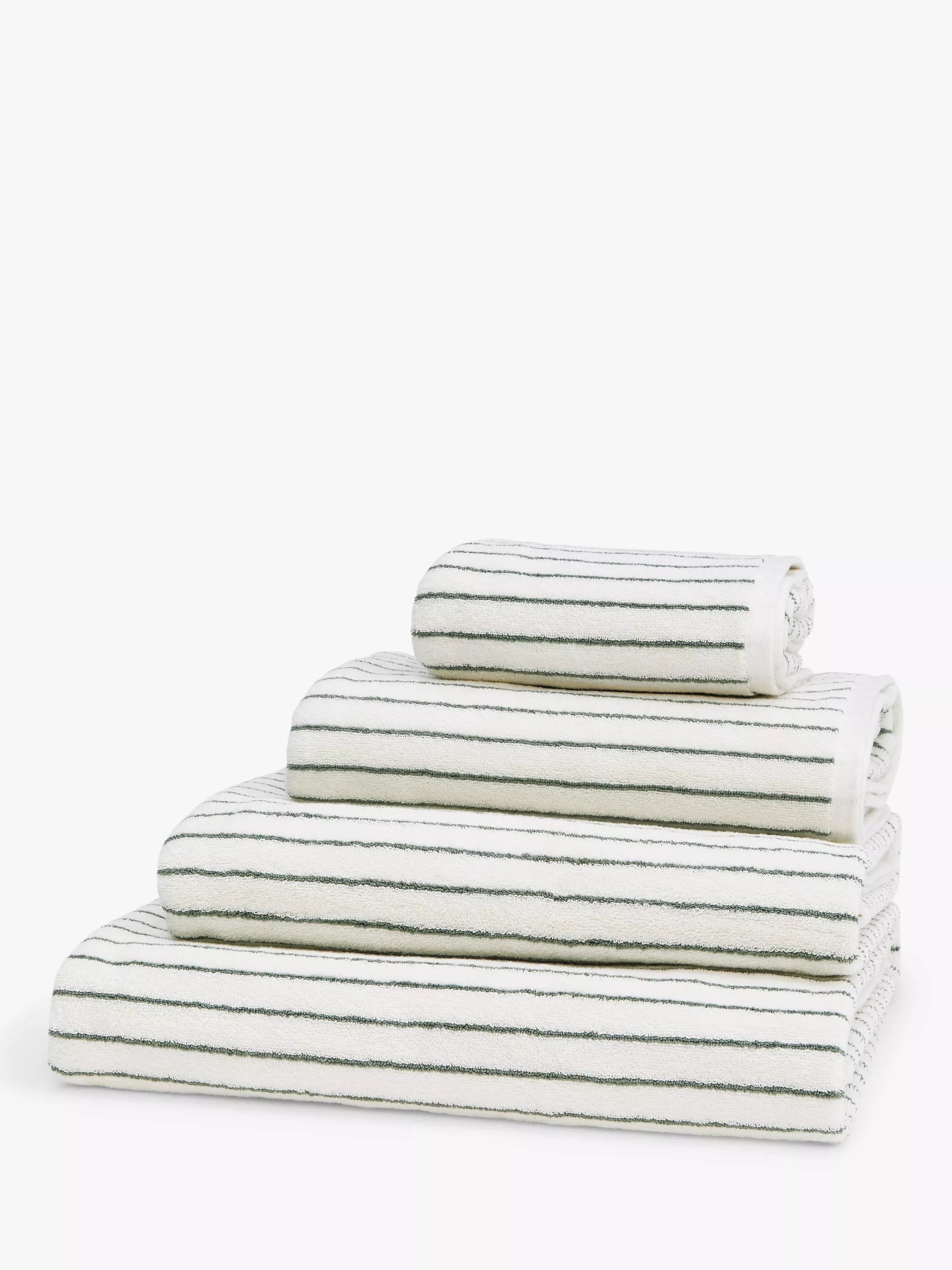 A natural ground with a soft, absorbent Egyptian cotton pile and fine stripe in three on-trend shades.