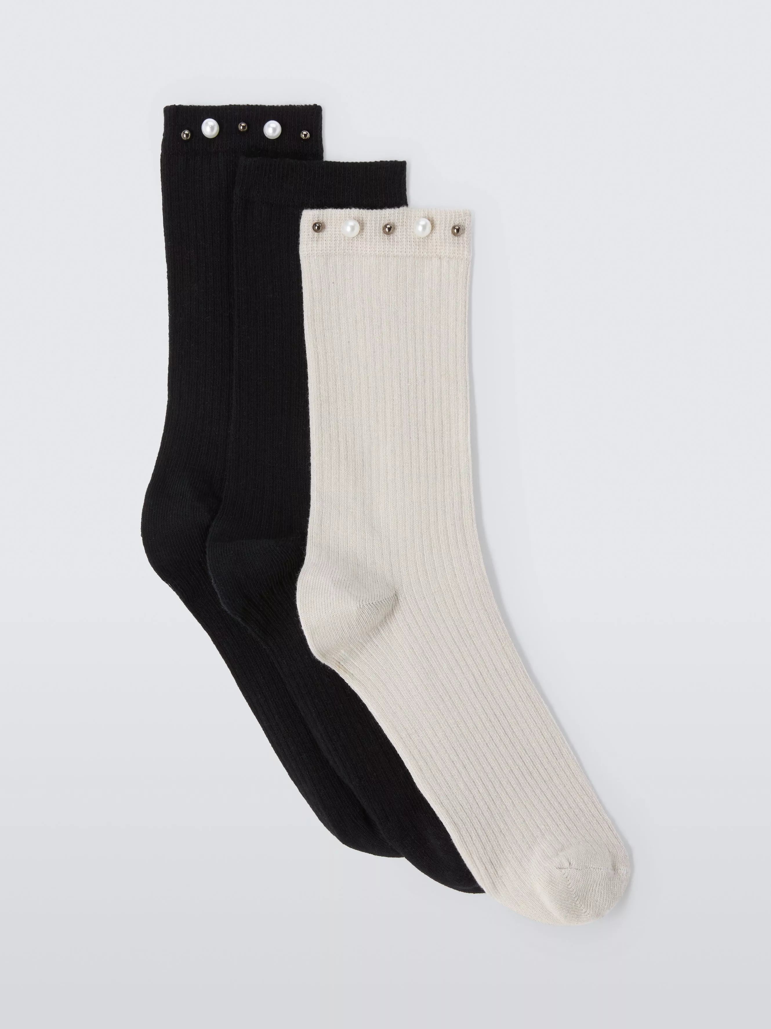 A set of 3 cotton-blend ribbed socks with charming, pearl-style embellishment.