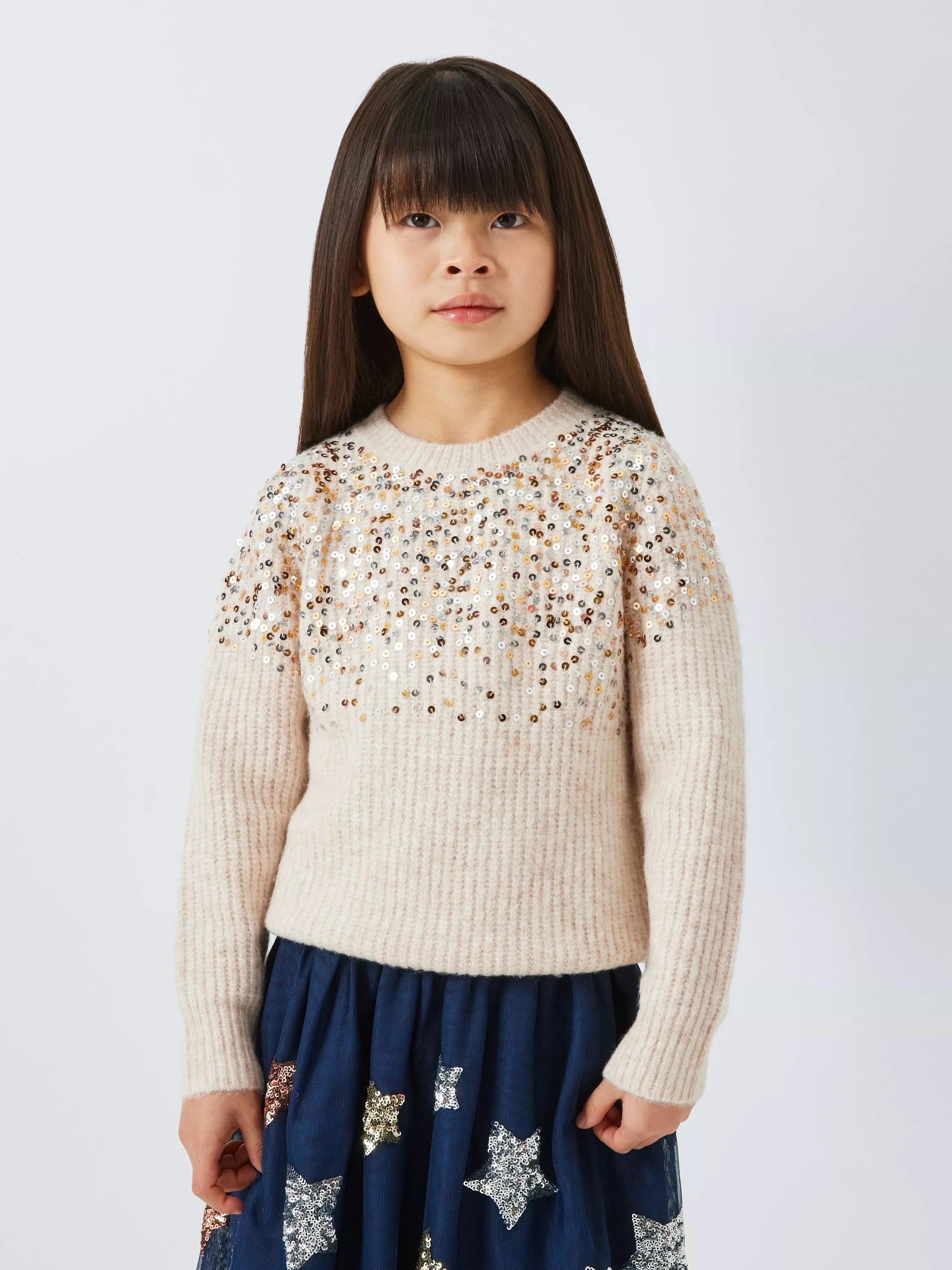 A cosy knitted jumper, elevated with scattered sequin detail across the shoulders and chest.
