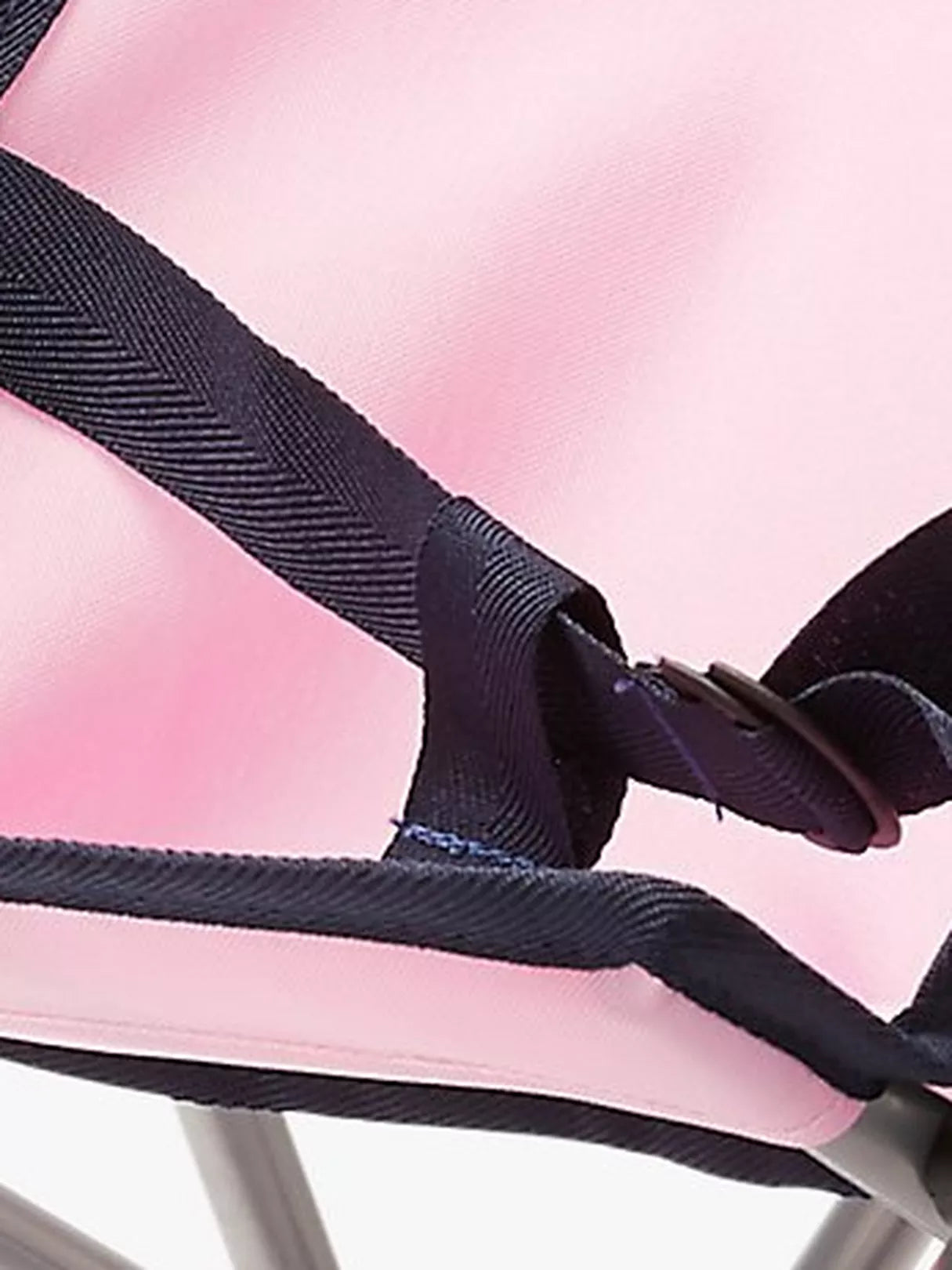 This doll buggy features a harness, double wheels and umbrella-style handles.