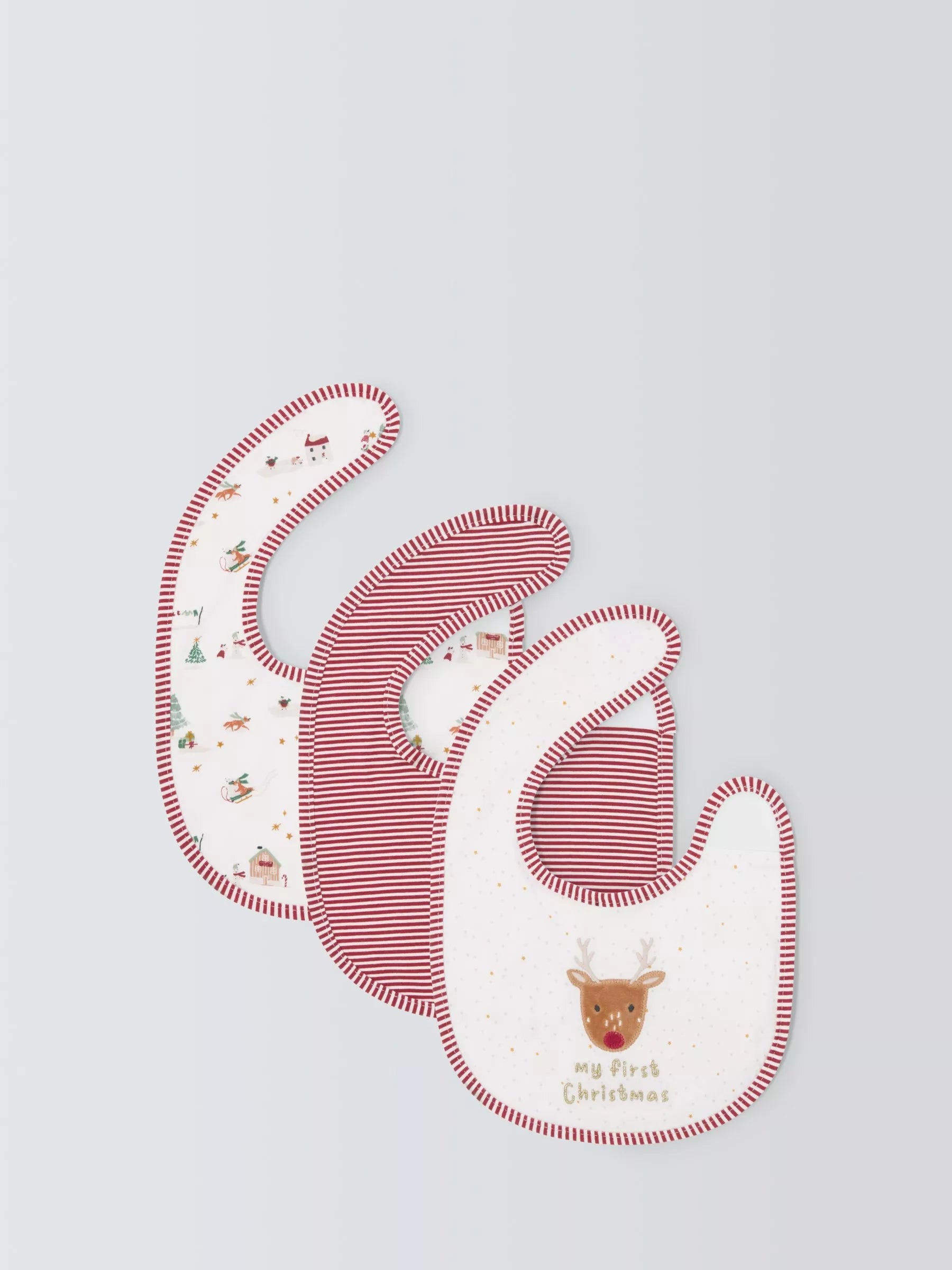 Commemorate your baby's first Christmas with this pack of 3 bibs, all with Christmas-inspired designs. Made from 100% cotton, they are soft, absorbent and gentle on baby's delicate skin. Secured with rip tape fastenings for easy on and offs.