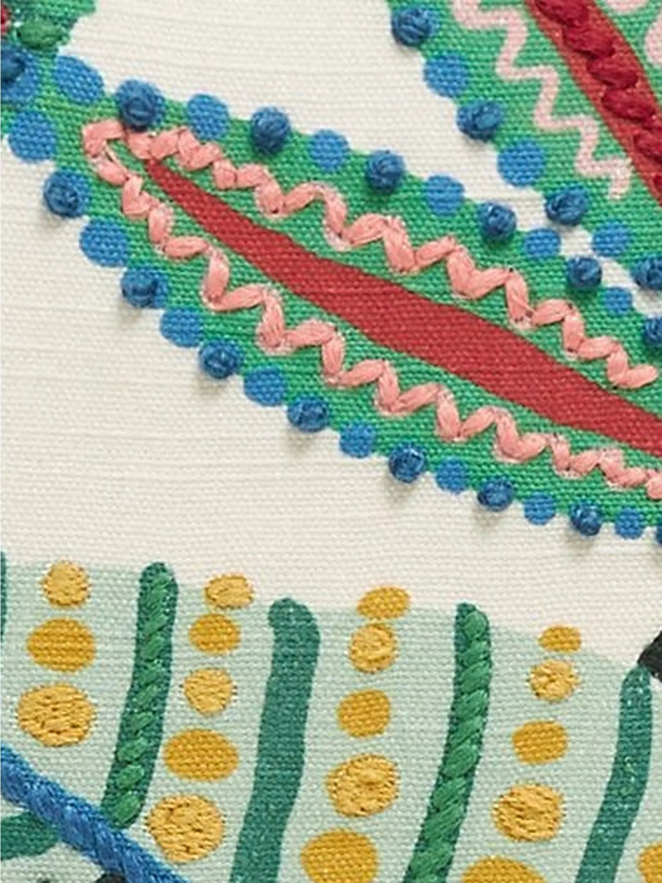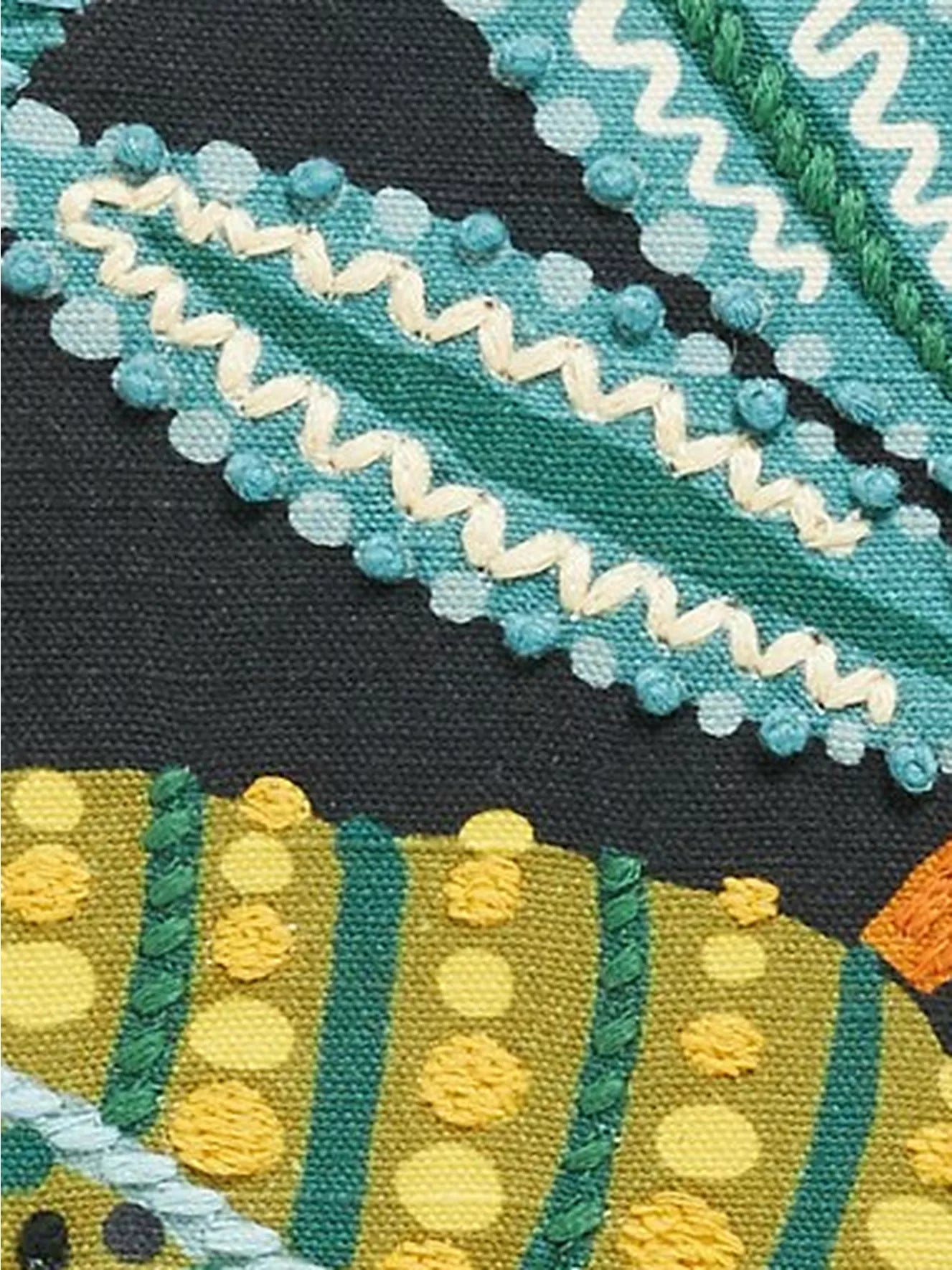 A digital print of colourful exotic leaves, given added vibrancy and texture with hand embroidery. The reverse is made from plush cotton velvet.