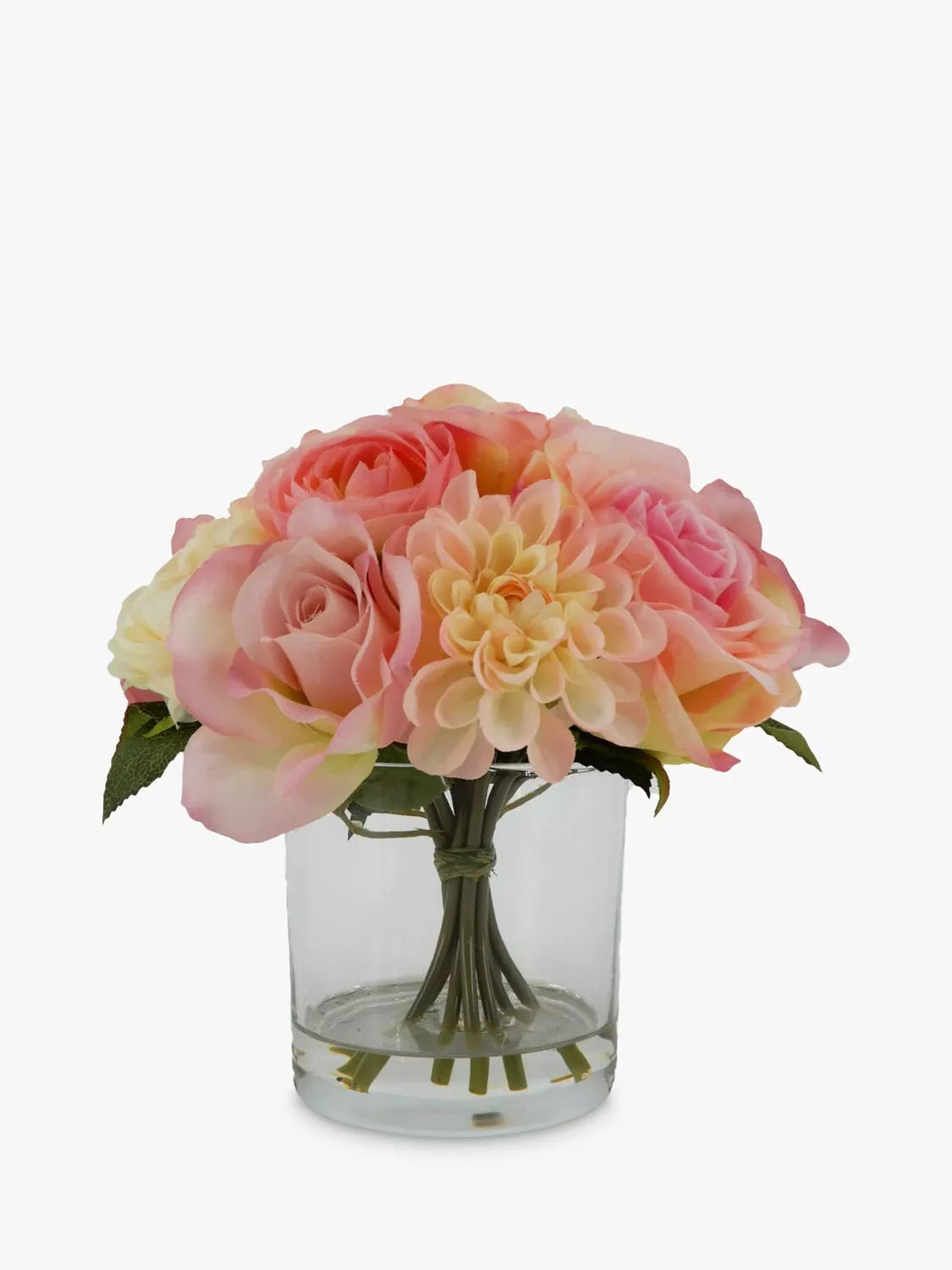 Add a touch of elegant beauty to any space with this stunning artificial rose and dahlia arrangement. This charming posy provides lasting beauty without any of the maintenance of real flowers, perfect for those who appreciate floral elegance but lack the time for constant upkeep.