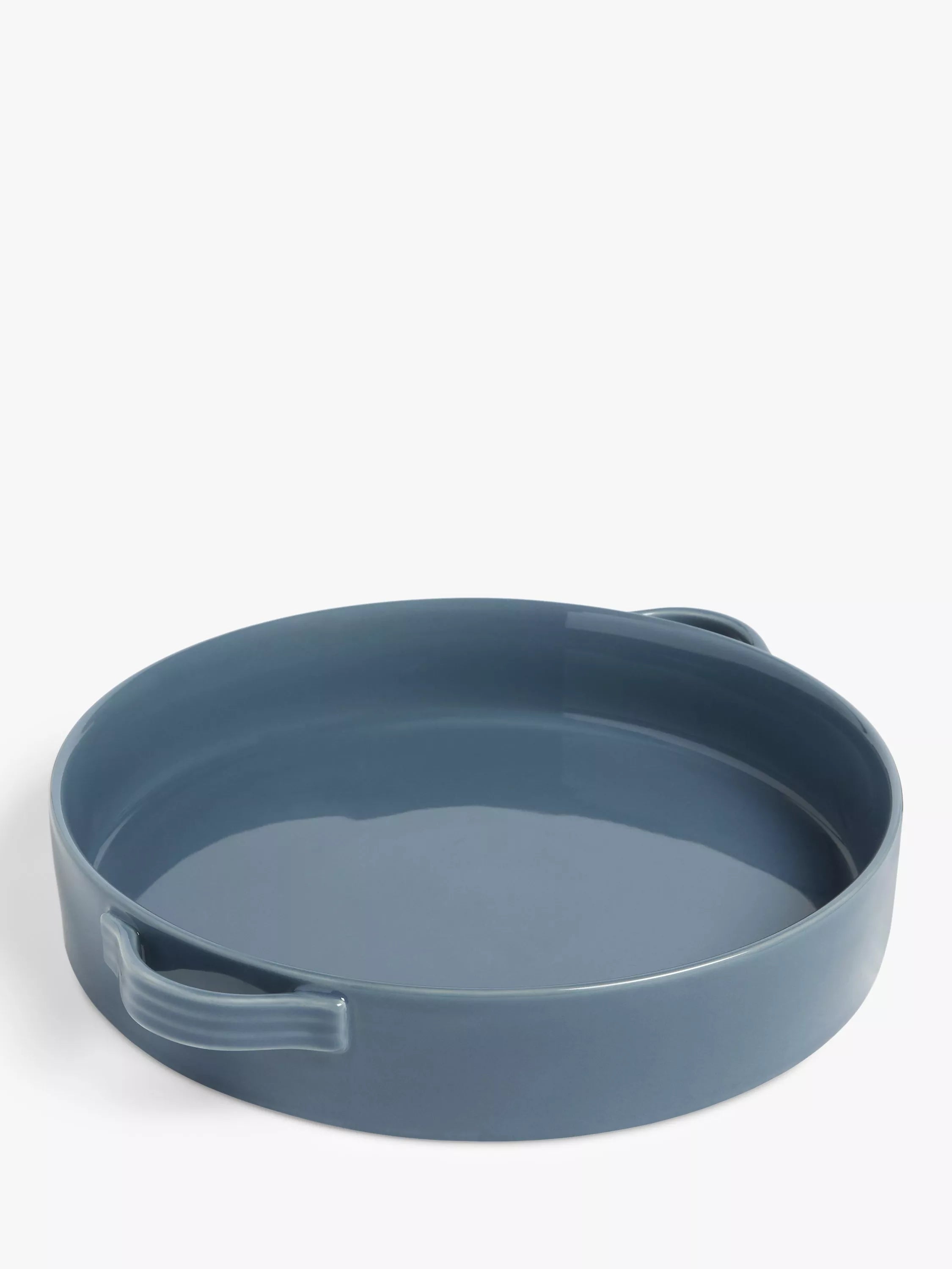 Round stoneware pie dish with twin handles for oven-to-table use. Dishwasher and microwave safe, as well as oven safe up to 250°C.