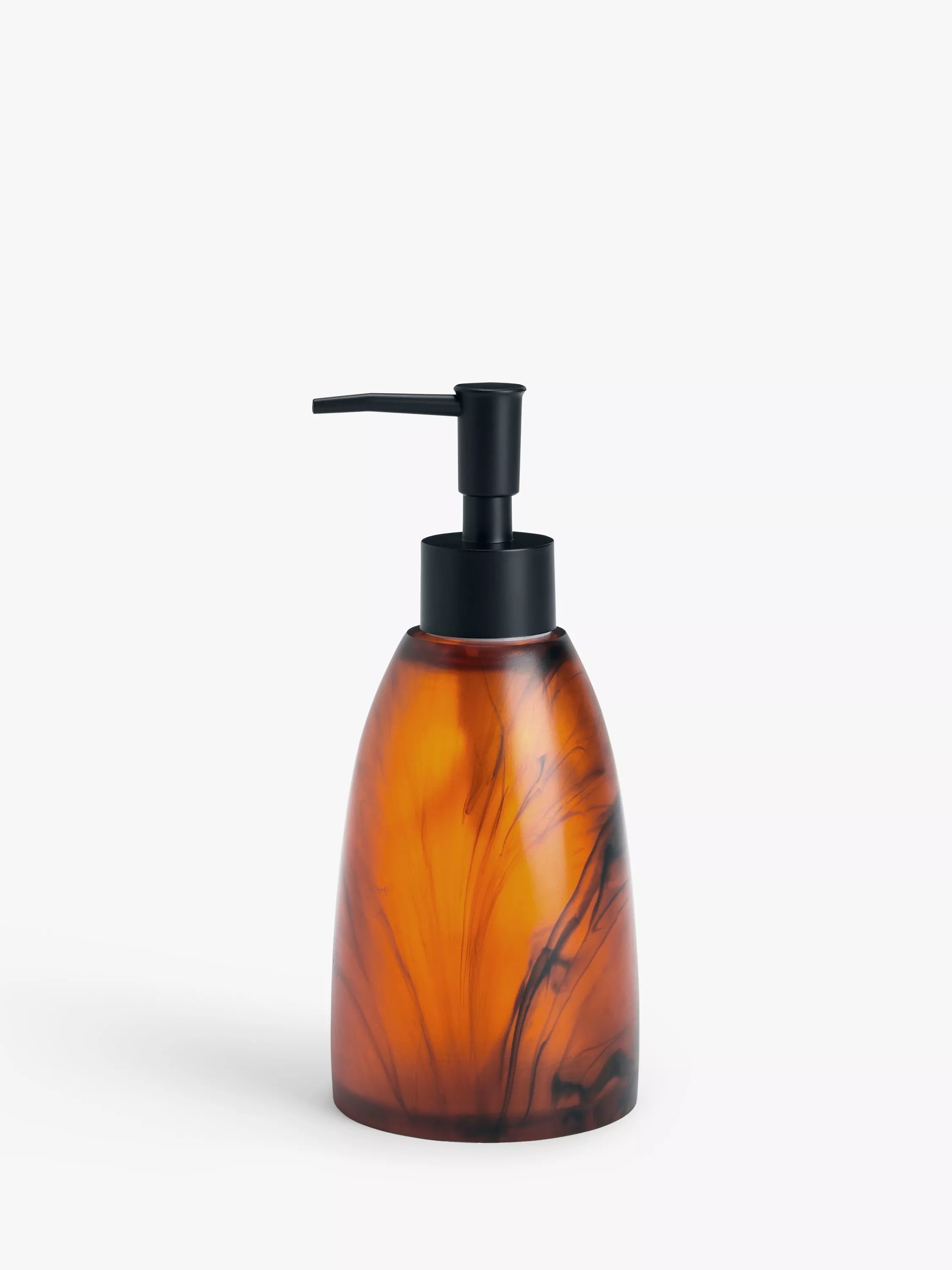 This polyresin soap dispenser has the warm look of precious amber for a sophisticated bathroom look.