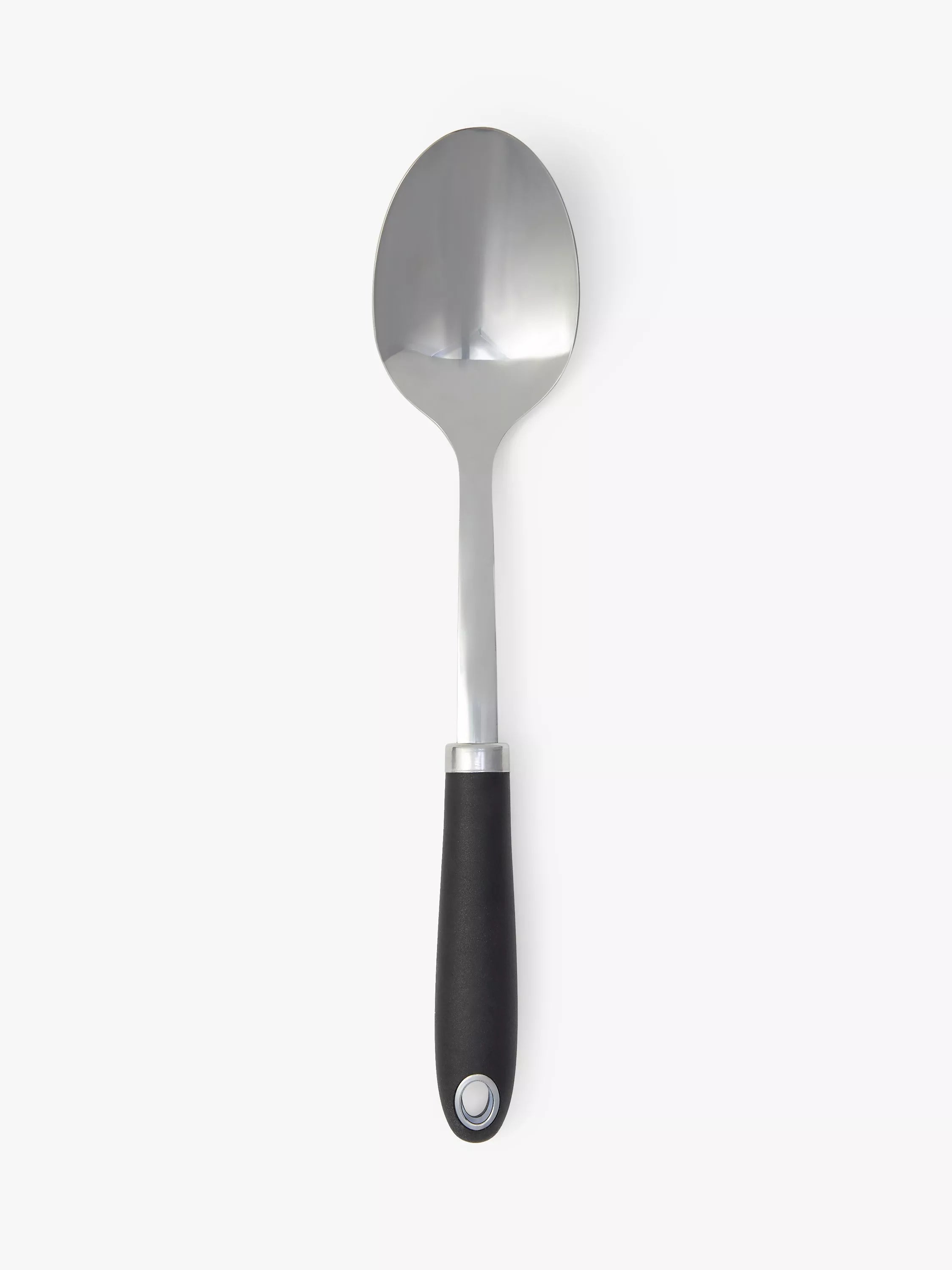 Solid spoon made of durable stainless steel. Dishwasher safe, it's easy to clean and has a hanging hole for storing. The soft-grip silicone handle makes it comfortable to hold and use.