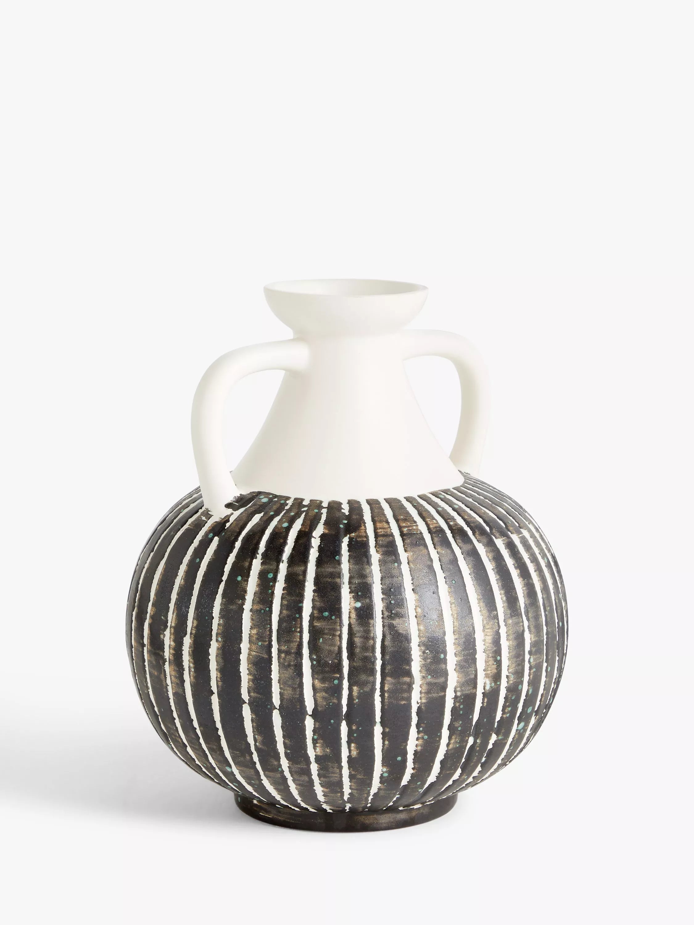 Shaped like an Ancient Greek amphora vase we've given the bulbous belly of this vase a striped design to immediately draw the eye to it.