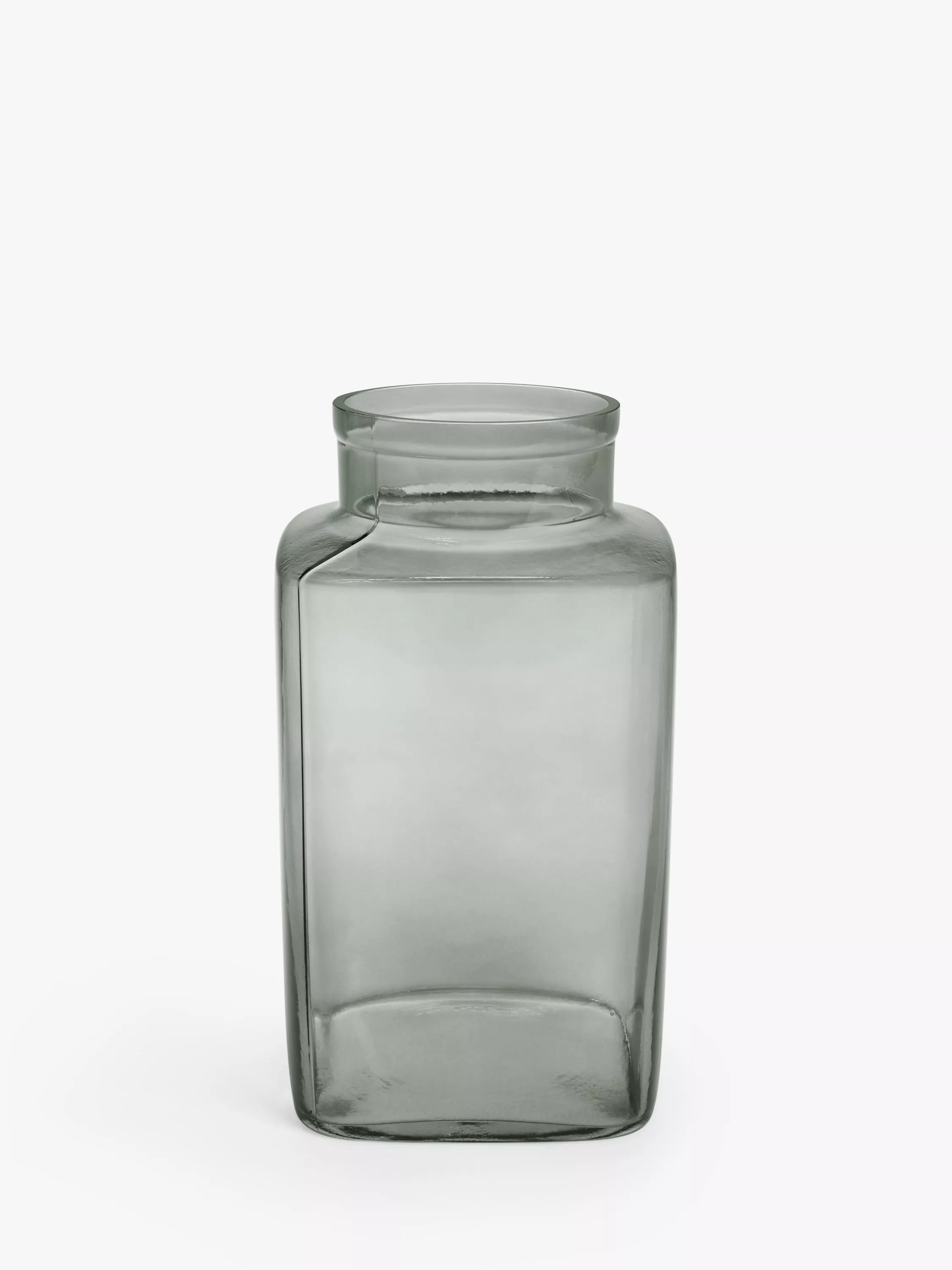 Square bottle vase softened by rounded edges and a subtle tint to the glass.