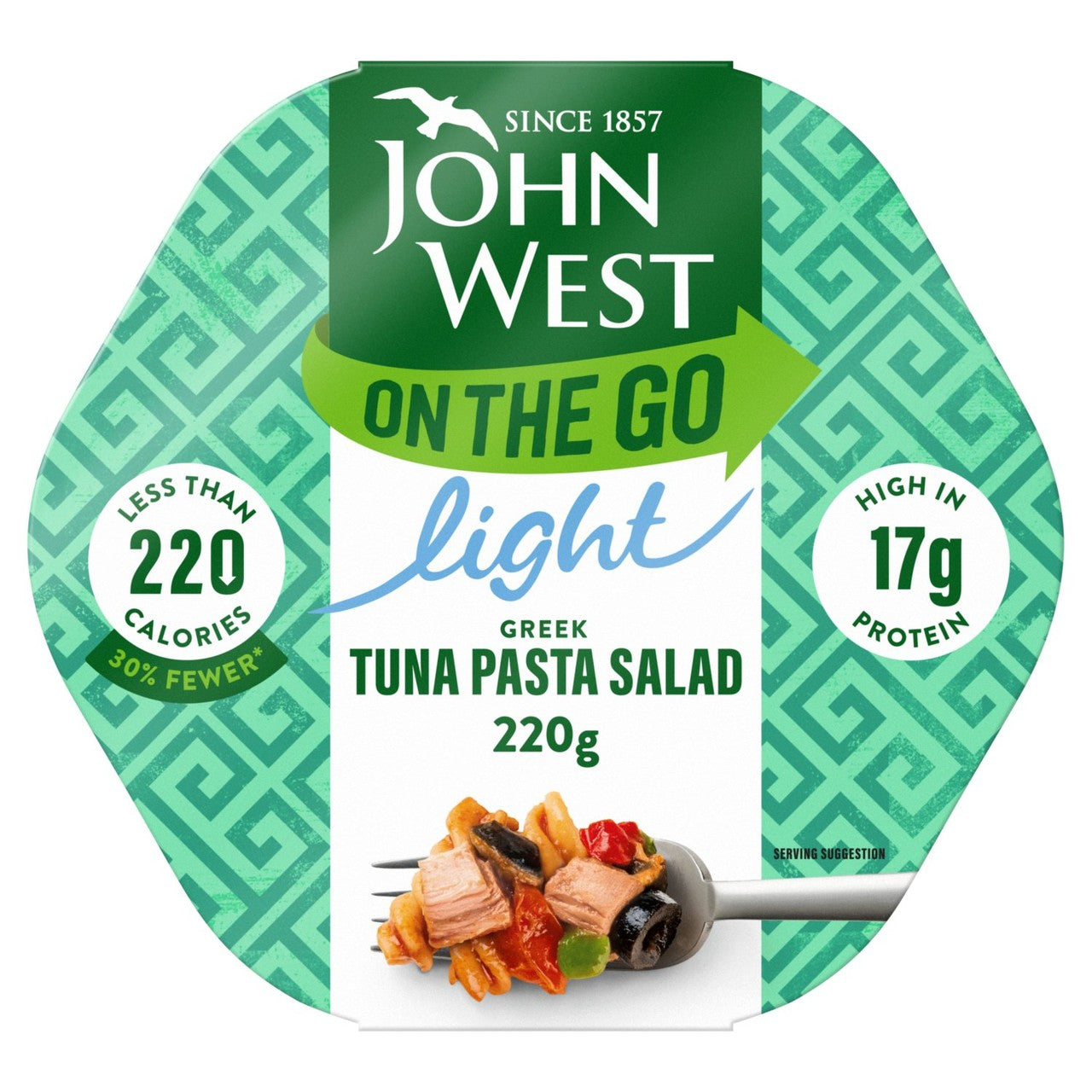 John West On The Go Greek Tuna Pasta Salad is a ready-to-eat meal portioned at 220g for straightforward consumption. This salad offers a convenient lunch solution packed with flavour and beneficial nutrition. It is specifically formulated to be lower in calories than the brand's standard tuna salad ranges.